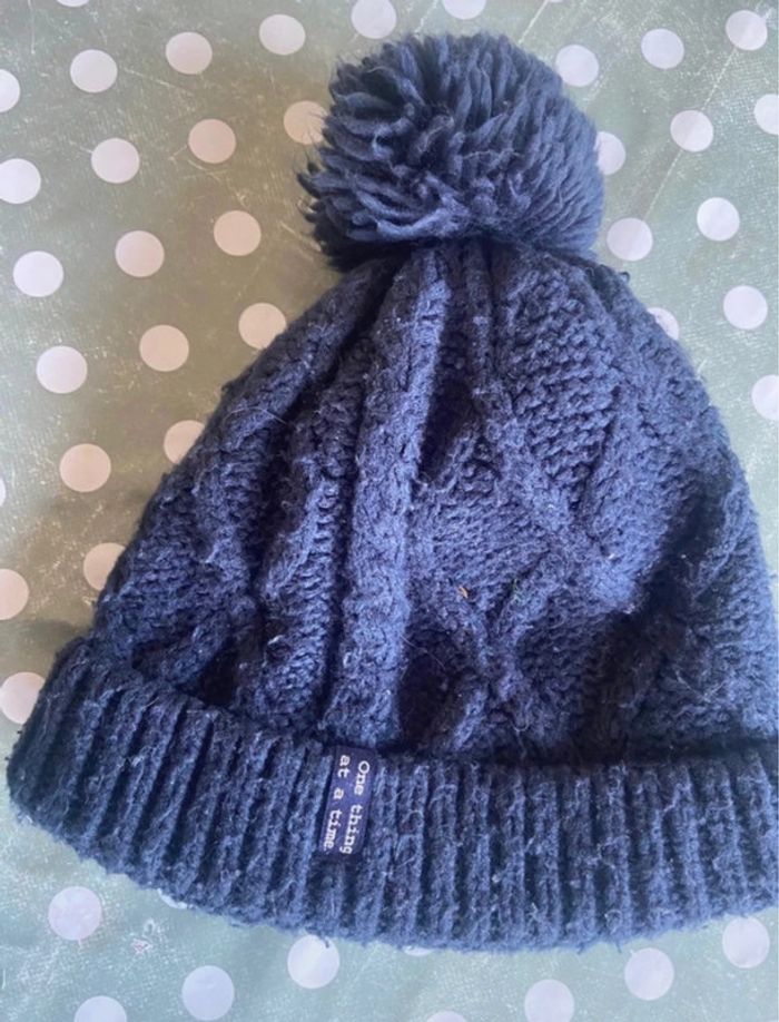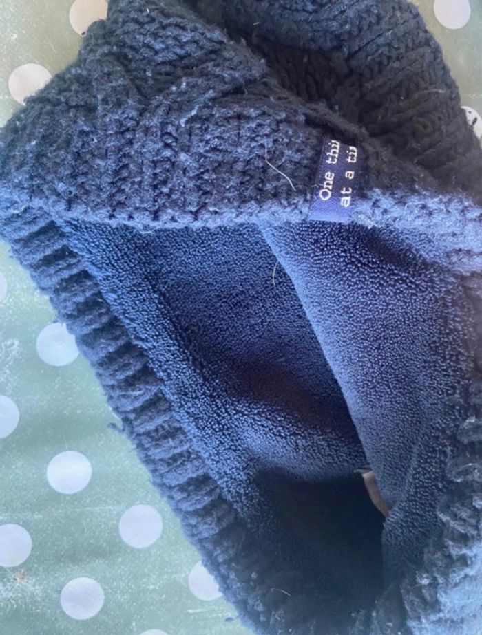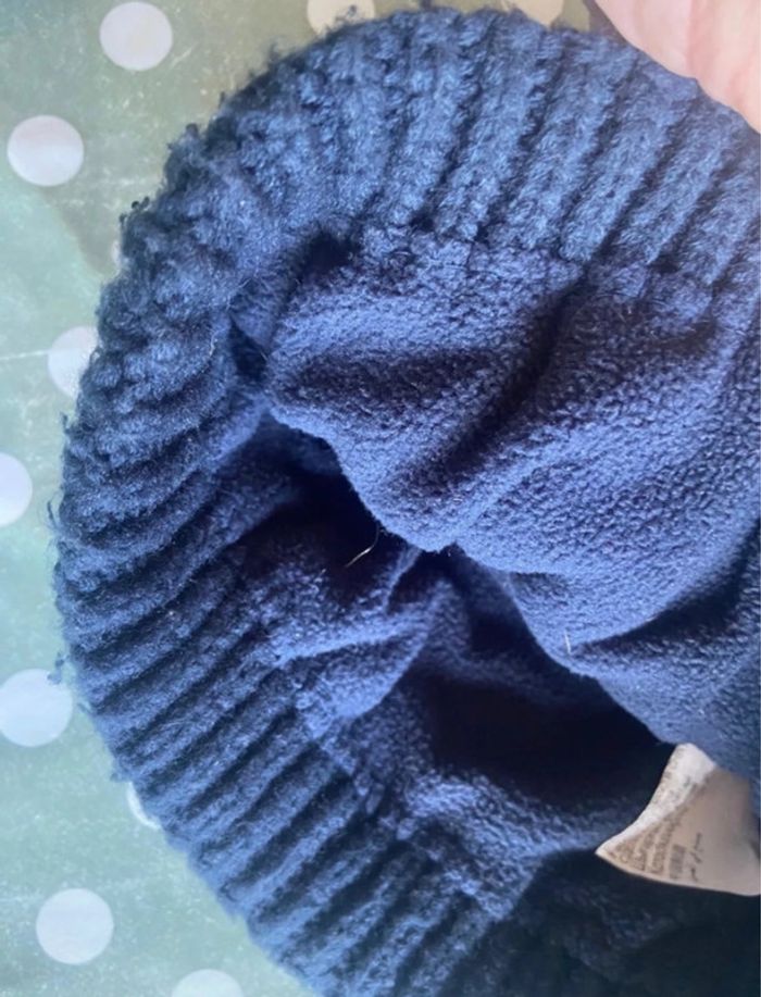 Lot bonnet à pompon tout de cou moufles 6 ans 100% acrylique 1 bonnet à pompon doublé polaire marine 1 tour de cou doublé polaire marine 1 paire de moufles marine