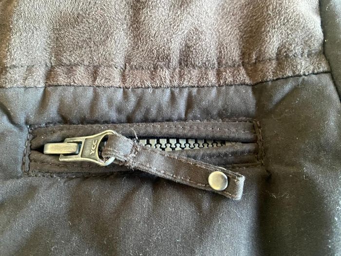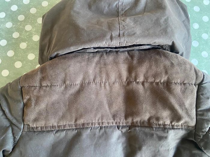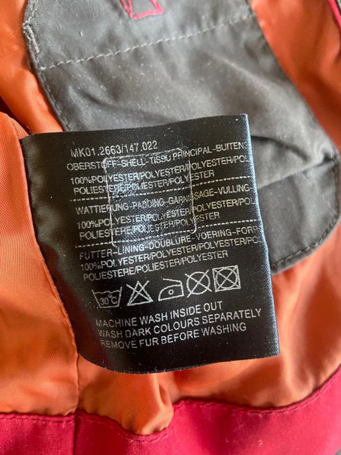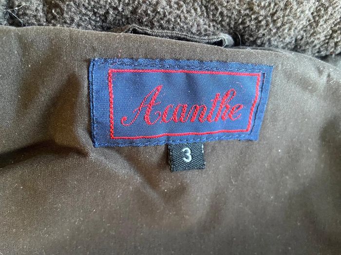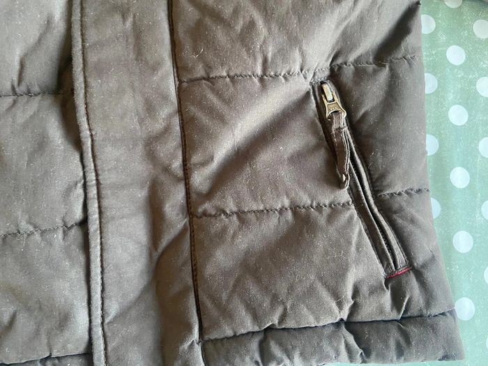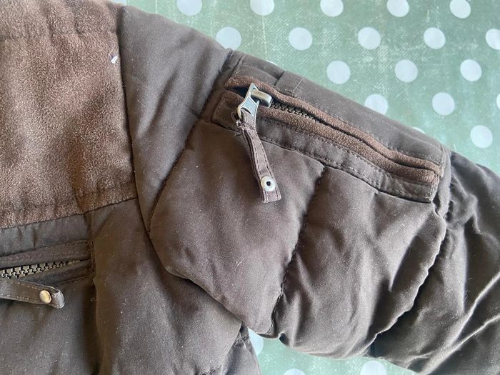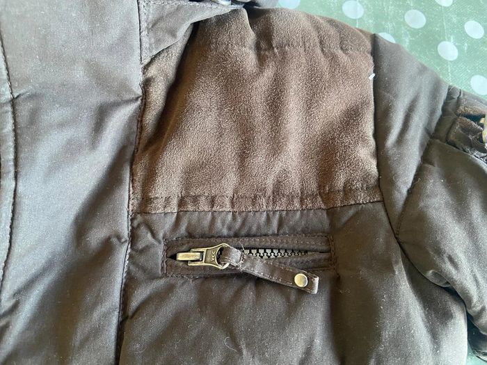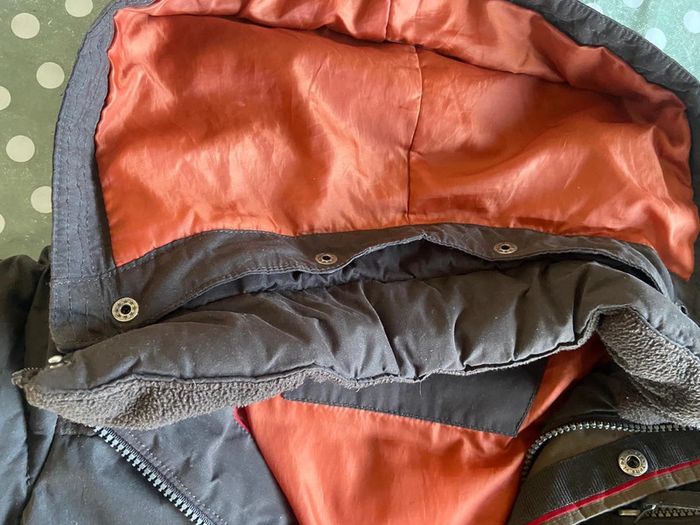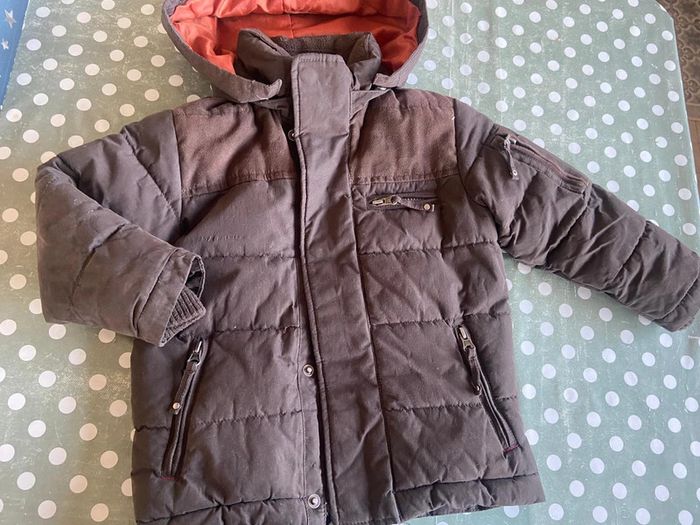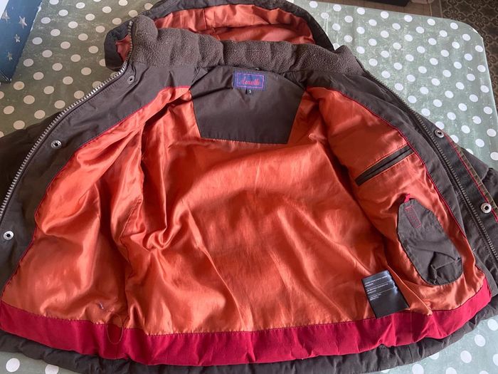 Parka marron à capuche amovible Acanthe 3 ans Plusieurs poches Intérieur couleur brique Fermeture éclaire cachée sous rabat boutons pression Capuche amovible boutons pression Très chaud 100% polyester Excellent état