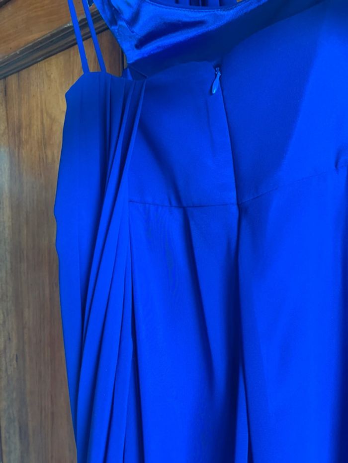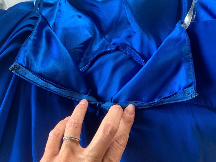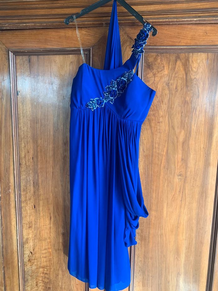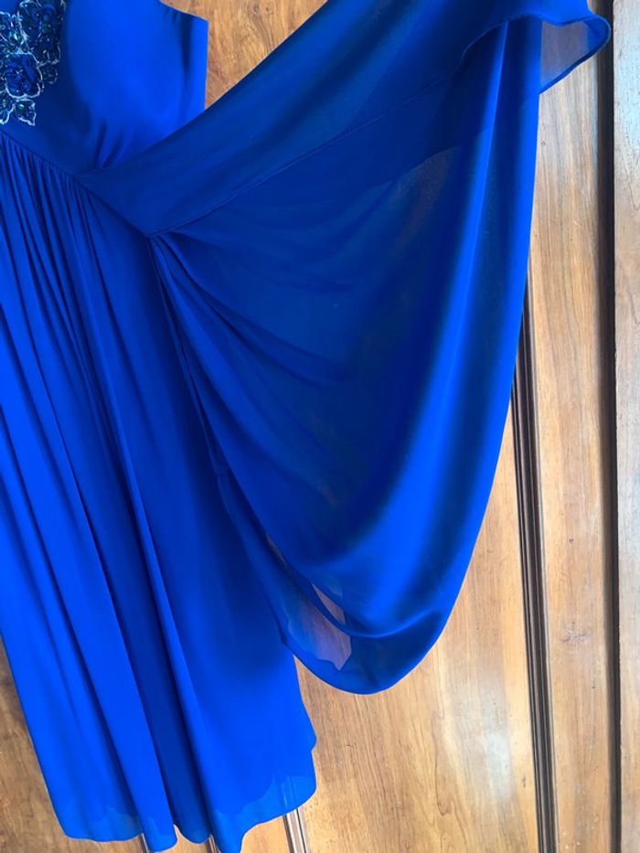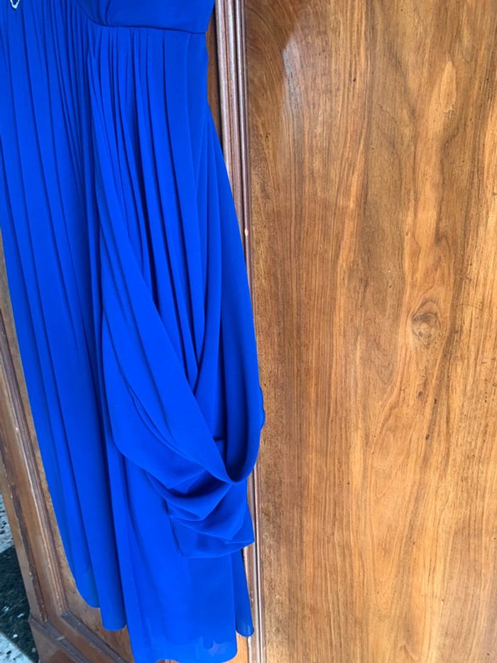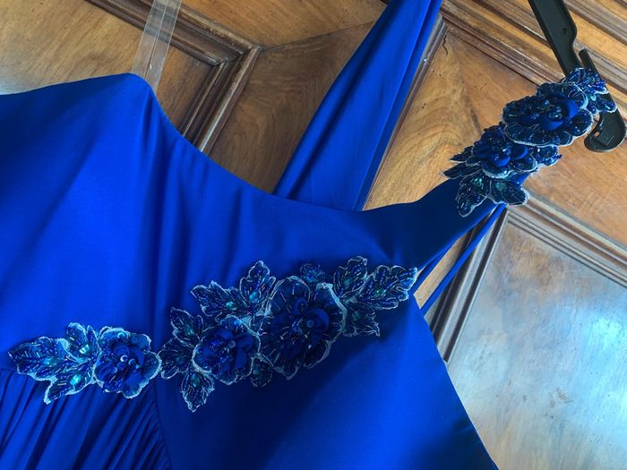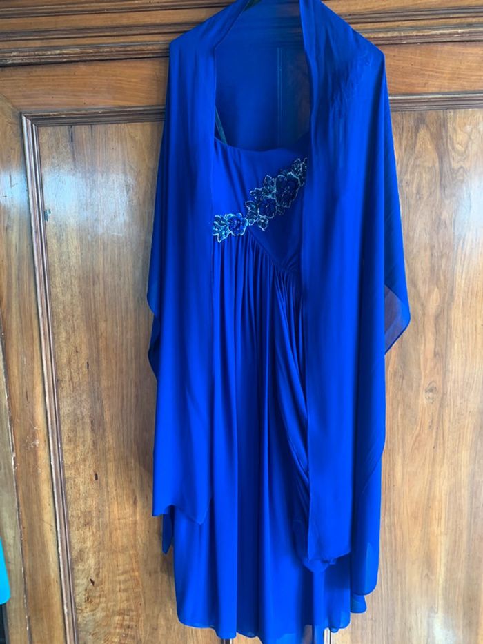 Robe de soirée T. 42 Applications fleurs brodées avec perles et sequins sur poitrine gauche. Épaule droite dénudée avec bride transparente. Fermeture par fermeture éclair dans le dos, plus crochet de sécurité. Étole assortie Jamais portée (achetée pour changer de tenue lors d’un mariage, du coup je n’ai pas changé de robe…) Prix d’achat neuf: 80€
