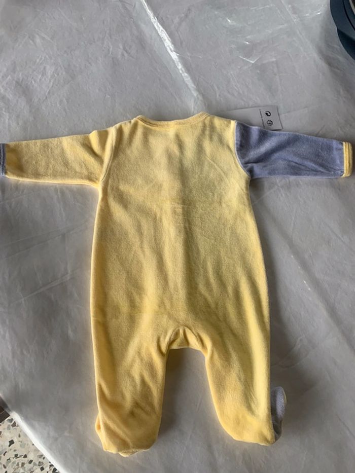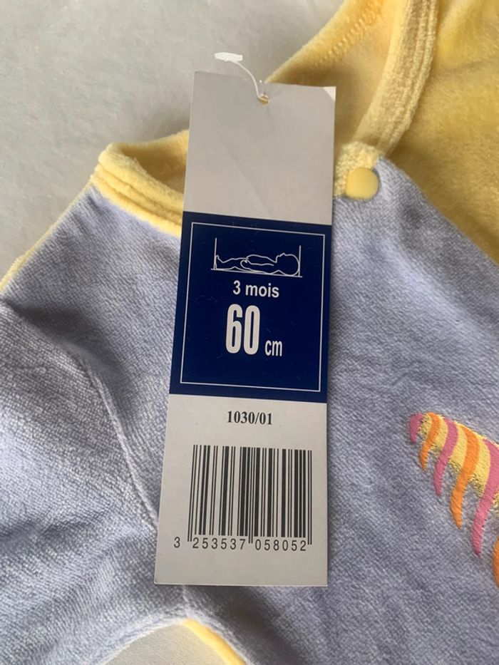Pyjama 3 mois neuf Neuf avec étiquette. Fermeture face avant par boutons pression en plastique jaune. Couleurs: jaune et bleu lavande.