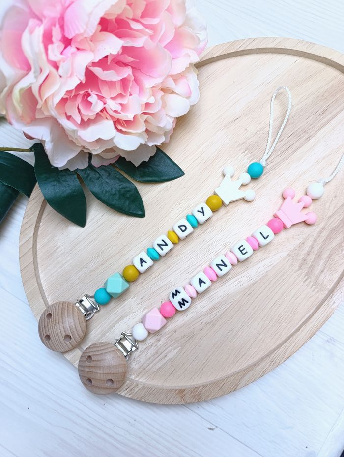 Attache tétine personnalisée couronne En bois naturel et silicone alimentaire Sans BPA ni autres substances toxiques D'autres coloris sont possibles Adaptateur mam vendu en supplément 1€ N'hésitez pas à me contacter pour plus d'infos. D'autres modèles sur ma page