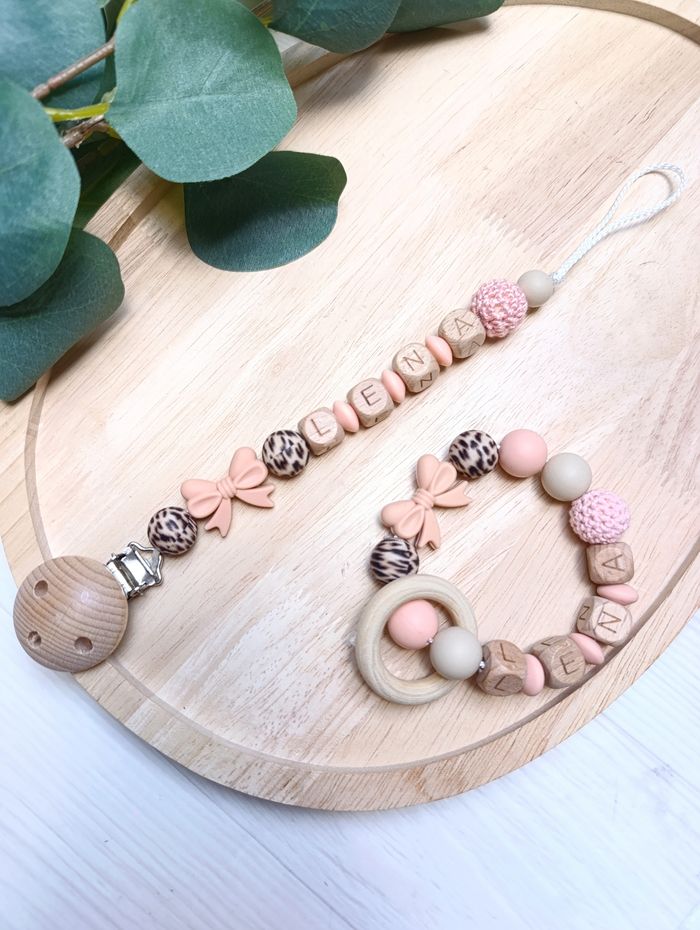 Attache tétine+ anneau de dentition noeud Bois naturel et silicone alimentaire Sans BPA ni autres substances toxiques Différents coloris possibles N'hésitez pas à me contacter pour plus de renseignements 💌
