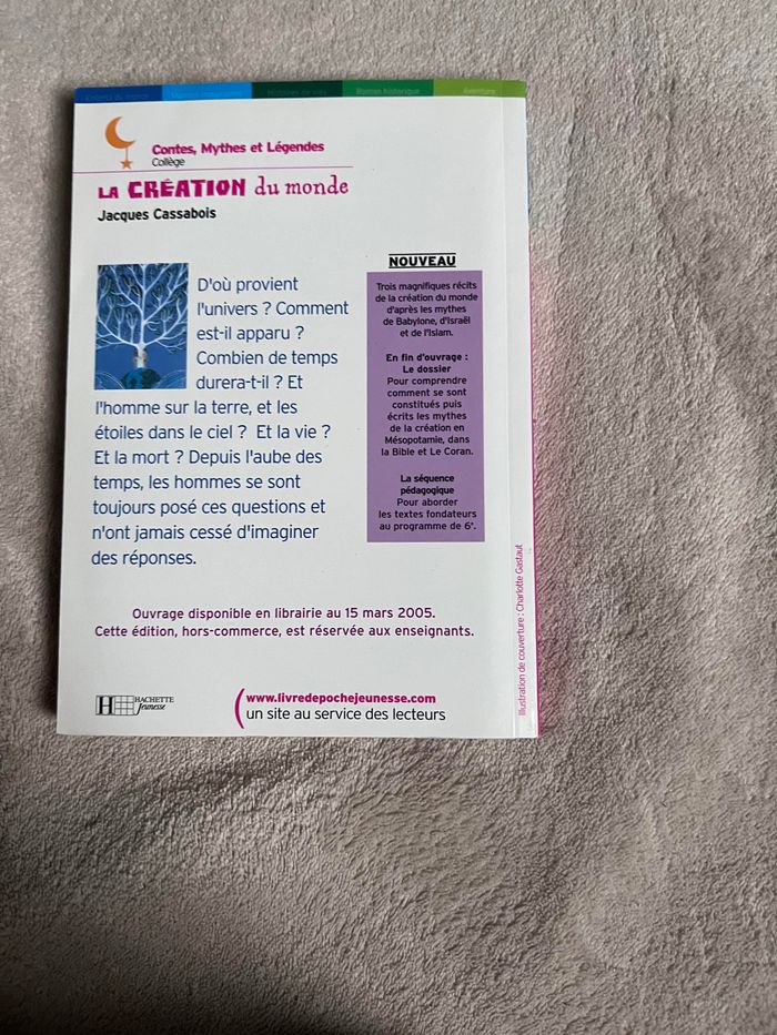 Livre - La création du monde - Jacques Cassabois - Le Livre de Poche - Collège 📚 Genre : Roman jeunesse / Mythes et légendes – Culture générale / Comptes Découvrez La création du monde de Jacques Cassabois, un livre captivant qui explore les grandes questions de l’existence : l’origine de l’univers, la vie, la mort, et le rôle de l’homme sur Terre. À travers des mythes, des légendes et des contes, ce récit invite les collégiens à réfléchir et à s’émerveiller sur le monde qui les entoure. Une lecture idéale pour les jeunes curieux et les passionnés de mythologie. 👉 N'hésitez pas à regarder mes autres annonces pour grouper vos achats 😉 Une réduction automatique est appliquée pour les lots. Je n'accepte donc pas d'offres supplémentaires sur les articles bénéficiant déjà d'une remise.