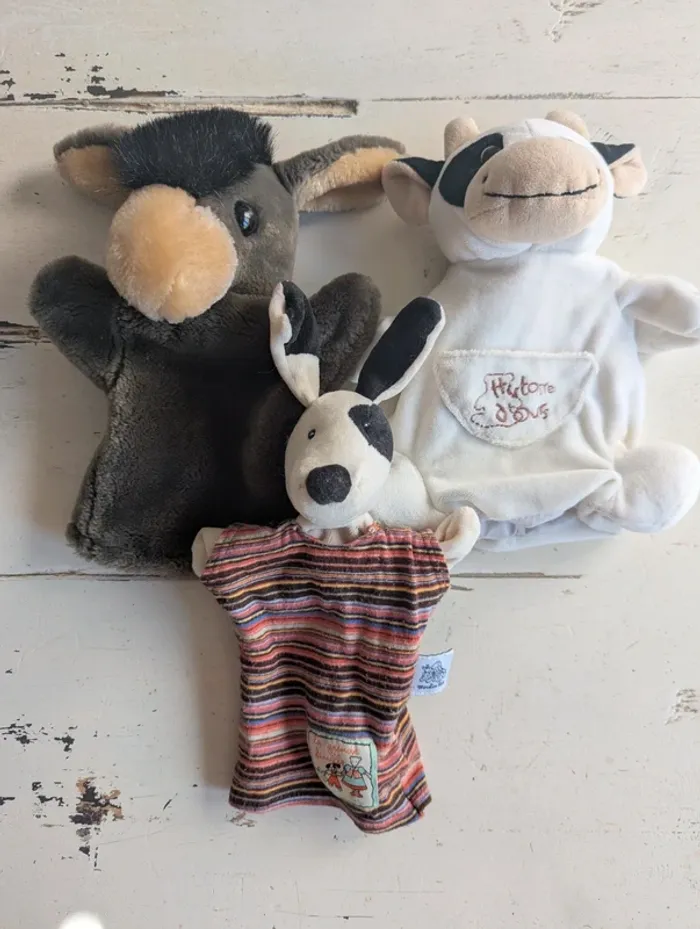 LOt de 3 marionnettes peluches adorables, parfaites pour éveiller l’imagination des tout-petits : 🐄 Vache – marque Histoire d’Ours, toute douce, en très bon état 🐴 Âne – sans marque, peluche agréable au toucher, très bon état 🐕 Chien – marque Moulin Roty (collection “Julius, La Grande Famille”), peluche marionnette de qualité, TBE ✨ Parfait pour le jeu, les histoires et les moments complices avec les enfants 🌿 Peluches propres, sans défauts notables, conservées avec soin D'autres jeux et jouets à vendre dans mon dressing #JeuxetJouetsDLau : n'hésitez pas à faire des lots pour amortir les frais de port et activer les réductions 😉