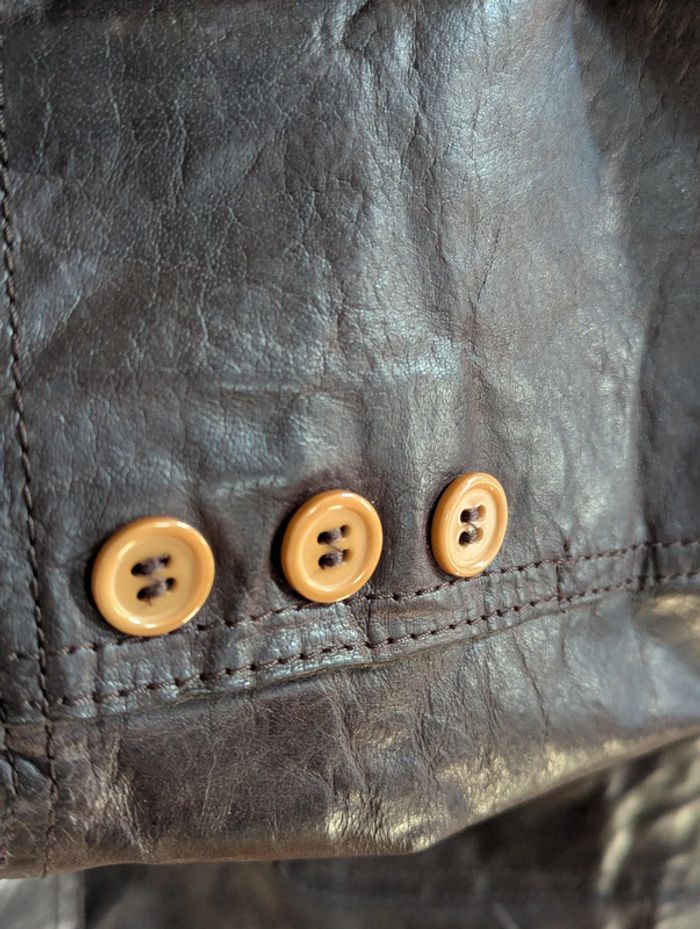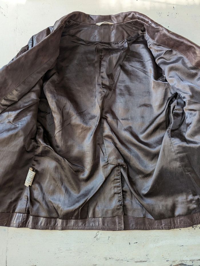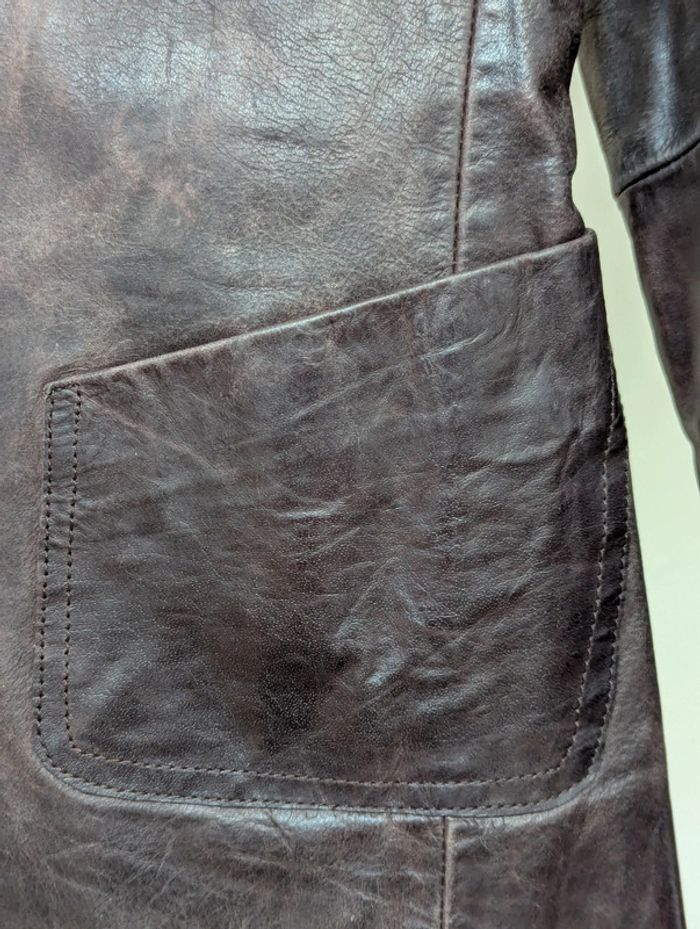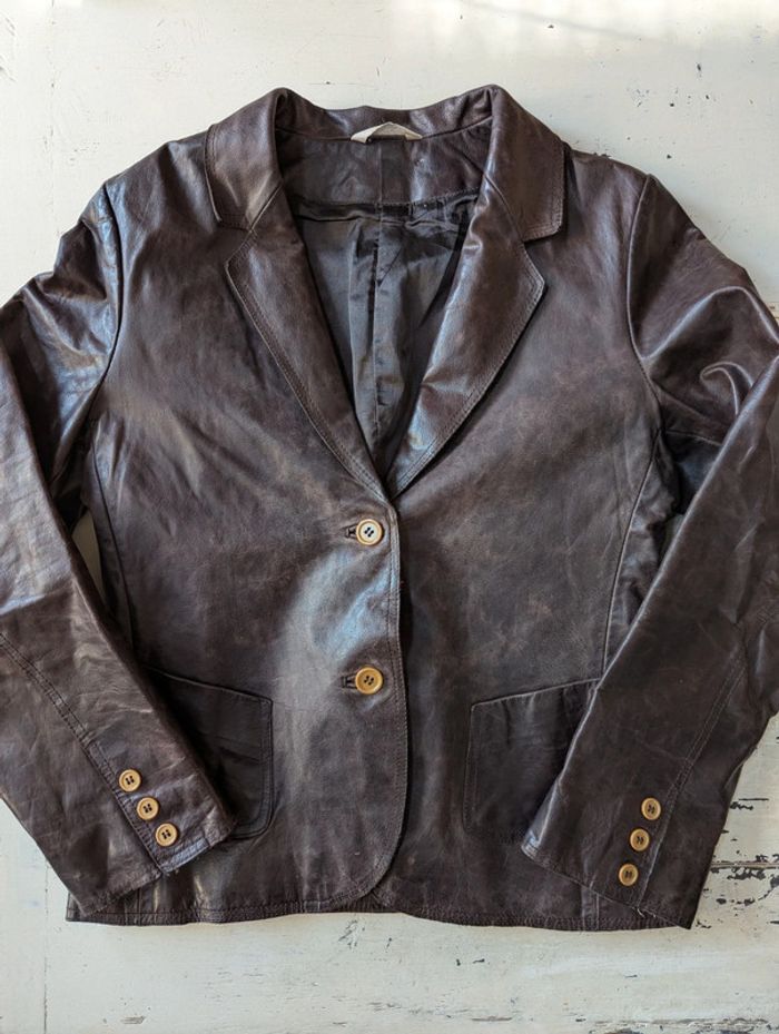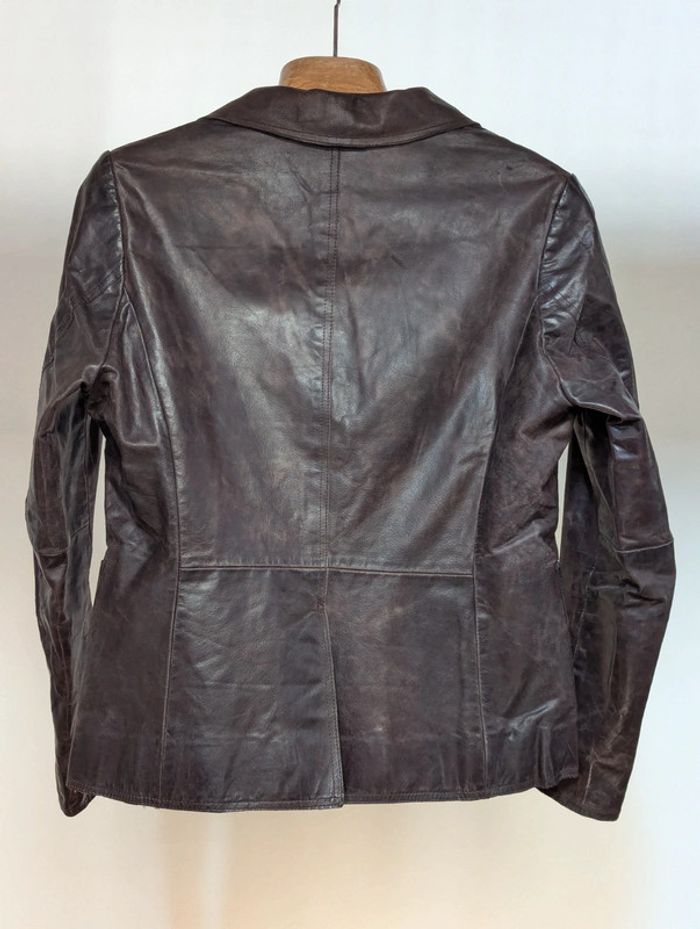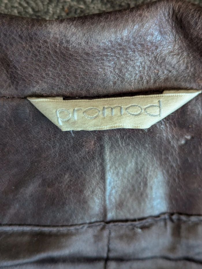 Veste blazer en cuir véritable avec une belle patine naturelle. Coupe droite, détails soignés, style intemporel. Marque : Promod Type : Veste / Blazer en cuir État : Très bon état Couleur : Marron Matière : - Extérieur : 100% cuir de buffle - Doublure : 100% polyester Détails : - Fermeture par deux boutons beiges contrastants - Trois boutons décoratifs sur chaque manche - Deux poches plaquées à l’avant - Fente au dos Taille / Mensurations : - Taille : 42 - Largeur épaule à épaule (coutures) : environ 41 cm - Longueur : environ 58 cm - Longueur manche : environ 60 cm D'autres vêtements pour femme #FemmeDLau à vendre dans mon dressing : n'hésitez pas à faire des lots pour amortir les frais de port et activer les réductions 😉