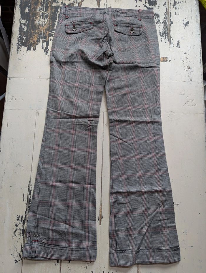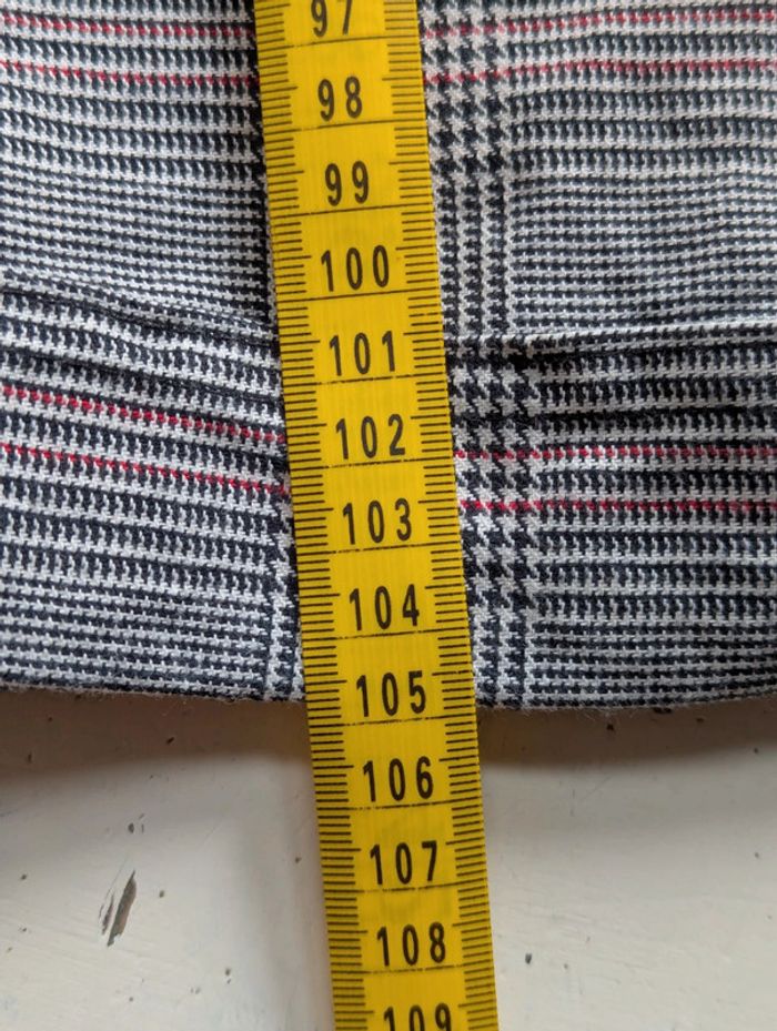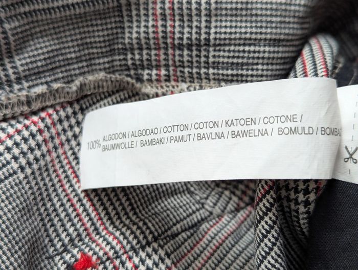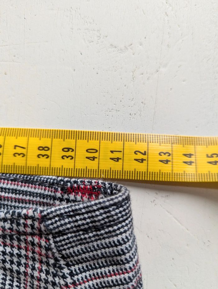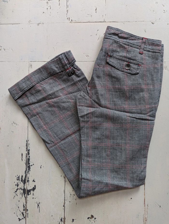 Pantalon vintage de la marque Bershka, motif Prince de Galles gris avec des touches de rouge. Coupe légèrement évasée. - Taille : 38 Largeur de taille : 41 cm Longueur du pantalon : 105 cm Hauteur du bassin (fourche) : 21 cm - Matière : 100% coton - Fermeture par bouton et zip, passants pour ceinture, poches latérales et décoratives à l’arrière. D'autres vêtements pour femme #FemmeDLau à vendre dans mon dressing : n'hésitez pas à faire des lots pour amortir les frais de port et activer les réductions 😉