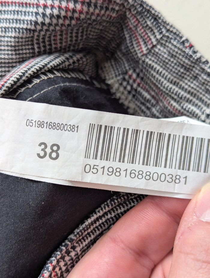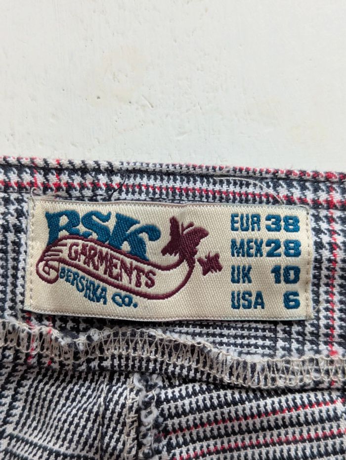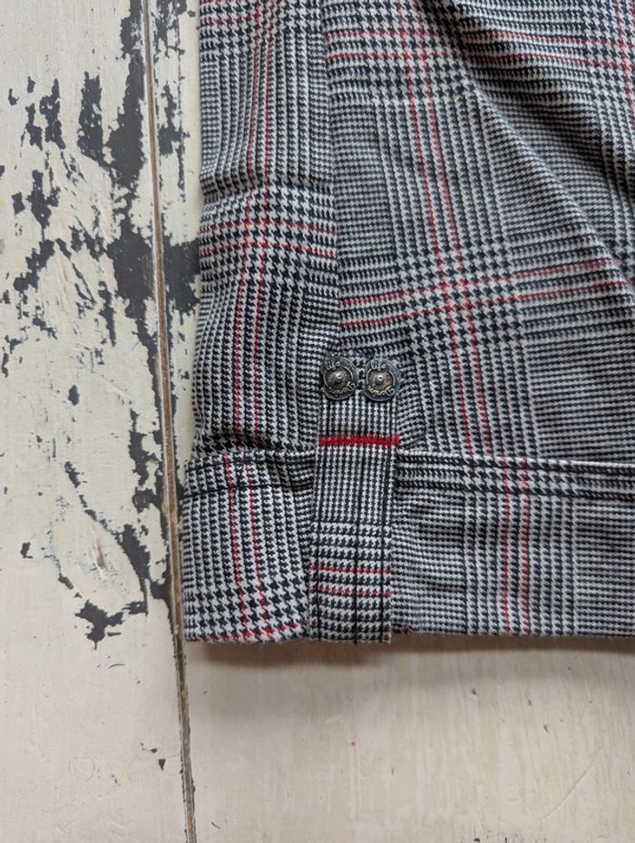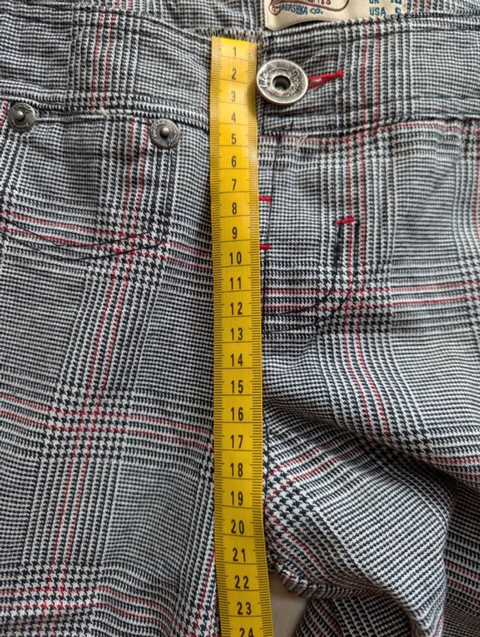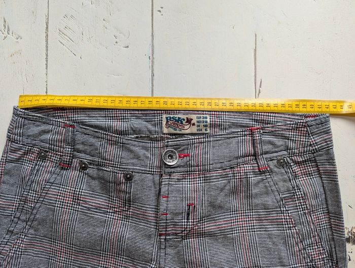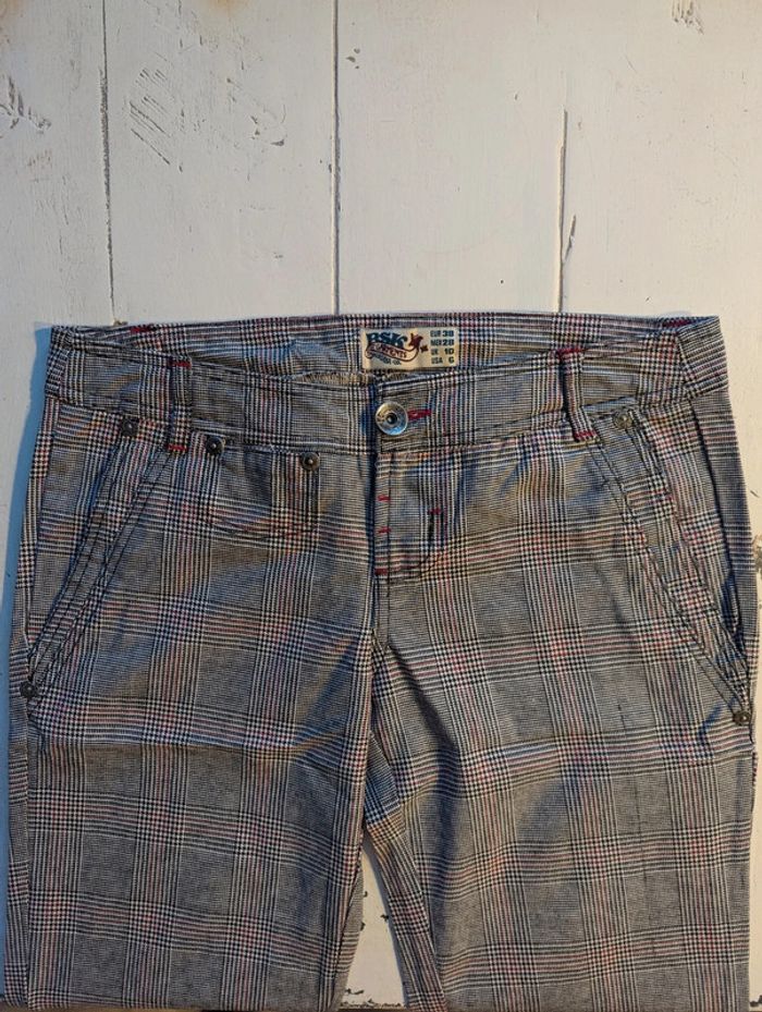 Pantalon vintage de la marque Bershka, motif Prince de Galles gris avec des touches de rouge. Coupe légèrement évasée. - Taille : 38 Largeur de taille : 41 cm Longueur du pantalon : 105 cm Hauteur du bassin (fourche) : 21 cm - Matière : 100% coton - Fermeture par bouton et zip, passants pour ceinture, poches latérales et décoratives à l’arrière. D'autres vêtements pour femme #FemmeDLau à vendre dans mon dressing : n'hésitez pas à faire des lots pour amortir les frais de port et activer les réductions 😉