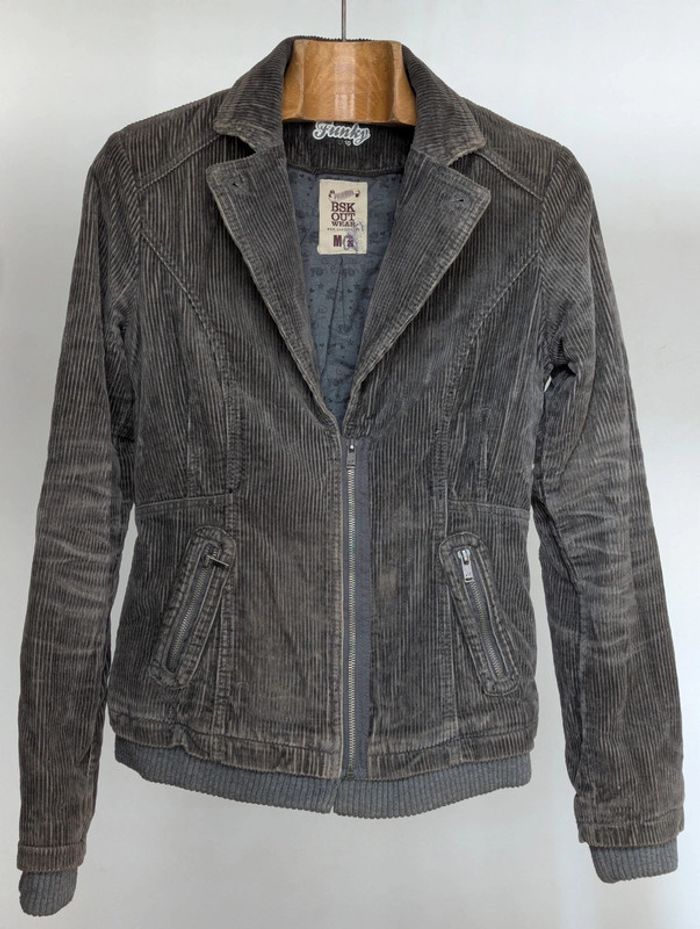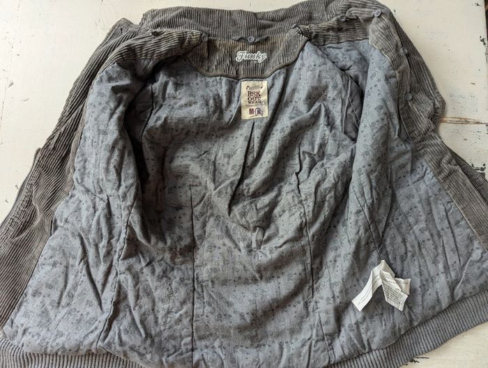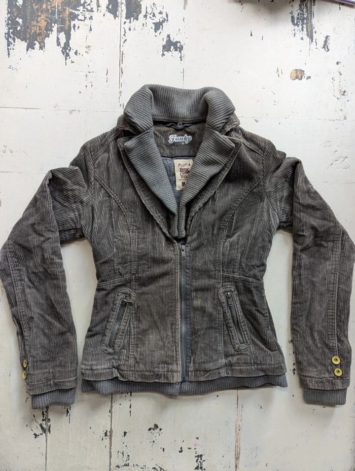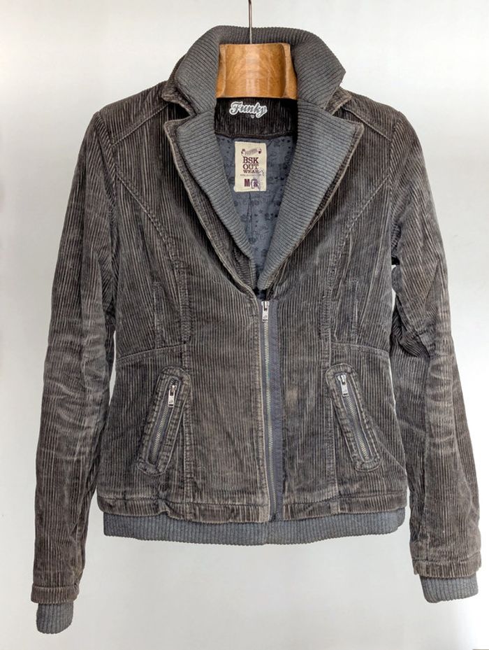 Veste style vintage et casual en velours côtelé gris anthracite. Col détachable permettant de varier les looks ! Coupe ajustée, poches zippées et doublure imprimée. - Marque : Bershka BSK Out Wear - Taille : M (Mex 28) - Couleur : Gris anthracite - Matière : 100% coton (doublure imprimée) - État : Bon état (légères marques d’usure sur le velours, fermeture et boutons fonctionnels) - Col détachable en velours côtelé - Coupe ajustée - Fermeture zippée + deux poches zippées sur le devant - Poignets et bas en maille côtelée - Doublure intérieure imprimée avec motifs vintage 📏 Mesures : - Largeur épaules : 42 cm / 44 cm - Longueur totale : 56 cm D'autres vêtements pour femme #FemmeDLau à vendre dans mon dressing : n'hésitez pas à faire des lots pour amortir les frais de port et activer les réductions 😉