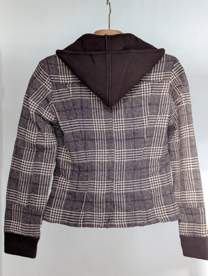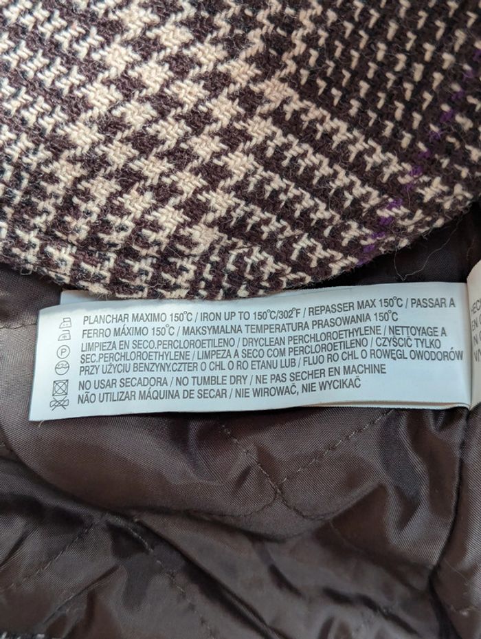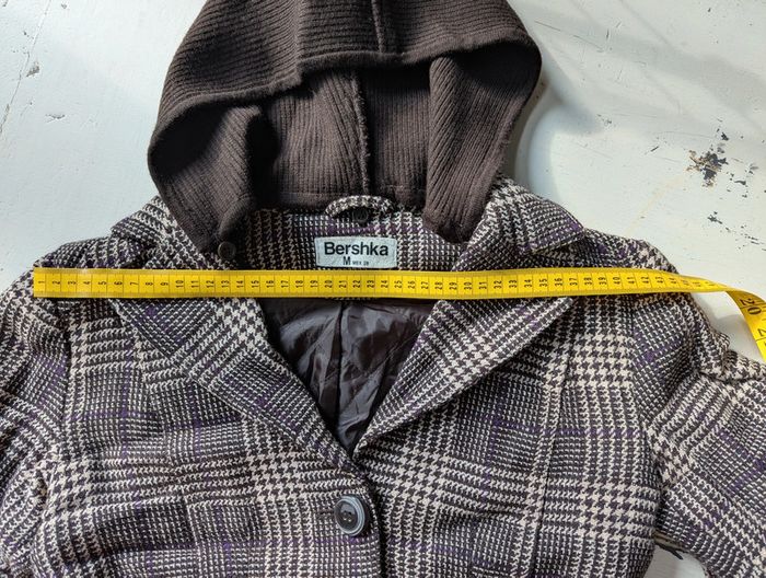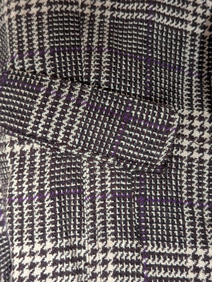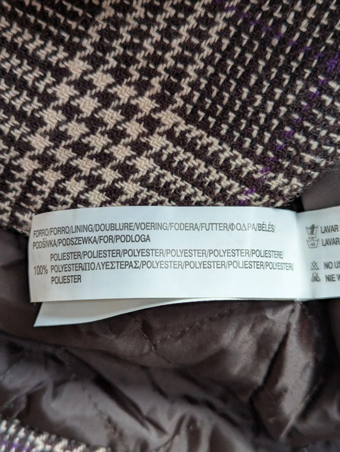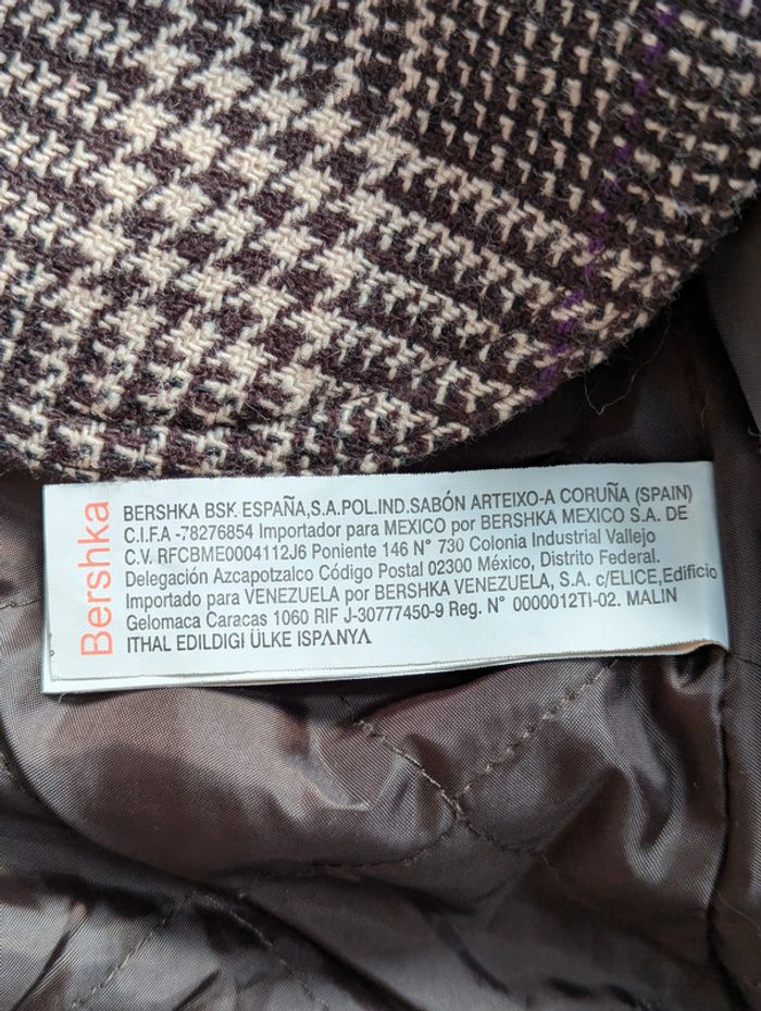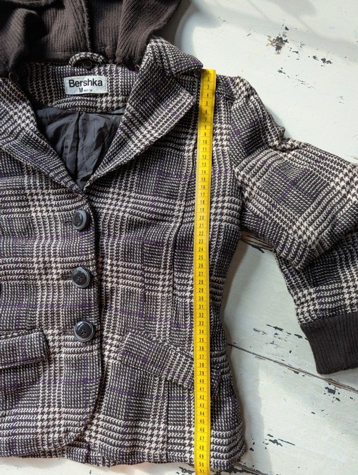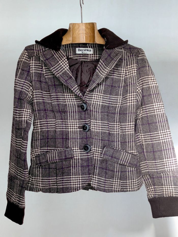 Blazer court Bershka au motif pied-de-poule marron et beige avec de légers fils violets : - Coupe courte et cintrée pour une silhouette élégante - Fermeture par trois boutons - Deux poches à rabat sur le devant - Col en velours côtelé marron, ainsi que les poignets pour un effet contrasté - Capuche détachable en tissu côtelé marron Taille : M (équivalent 38/40) : - Largeur d’épaule : 42 cm - Longueur totale : 50 cm D'autres vêtements pour femme #FemmeDLau à vendre dans mon dressing : n'hésitez pas à faire des lots pour amortir les frais de port et activer les réductions 😉