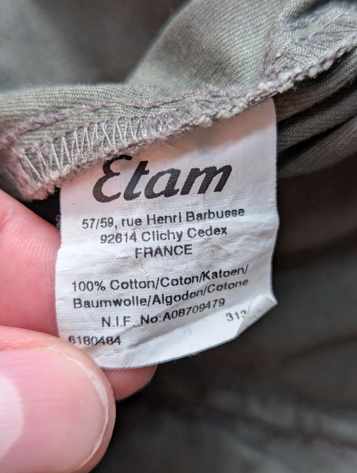 Veste saharienne/militaire mi-saison Etam, en 100% coton, avec des finitions soignées et un design structuré. Look casual chic, workwear ou utilitaire : - Taille : 40 (FR) - Matière : 100% coton, agréable à porter - Couleur : Kaki, un classique indémodable - Finitions contrastées : surpiqûres et bordures en coton légèrement vieilli pour un effet vintage - Poches asymétriques : poche droite : rabat arrondi à double boutons / poche gauche : rabat droit - Broderie discrète au niveau de la fermeture éclair - Fermeture zippée YKK cachée sous une patte boutonnée - Épaulettes boutonnées - État : Très bon état général D'autres vêtements pour femme #FemmeDLau à vendre dans mon dressing : n'hésitez pas à faire des lots pour amortir les frais de port et activer les réductions 😉