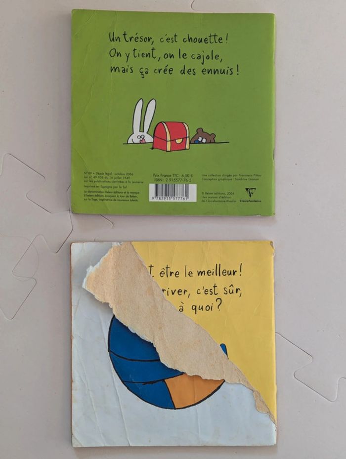Deux livres illustrés d’Alain Crozon de la série “Aldo”, l’un des personnages favoris des petits ! - Éditeur : Belem Éditions - Thèmes : émotions, amitié, jalousie, confiance en soi - Format : Livres souples, adaptés aux jeunes enfants - Idéal pour compléter une collection ou pour une lecture à petit prix. 📕 Le Trésor d’Aldo - ISBN : 9782915577761 - Bon état général (coin légèrement plié, pages OK) 📕 Aldo n’est pas le meilleur - ISBN : 9782915577778 - Couverture déchirée (voir photos), mais pages intérieures propre D'autres livres, jeux et jouets à vendre dans mon dressing #LivresDLau / #JeuxetJouetsDLau : n'hésitez pas à faire des lots pour amortir les frais de port et activer les réductions 😉