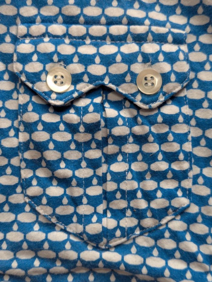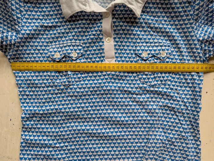 Polo vintage à manches courtes avec un motif bleu et blanc. Col blanc et fermeture à boutons sur le devant. Deux petites poches boutonnées au niveau de la poitrine. - Taille : 42 - Matière : 100 % coton - Couleur : Bleu et blanc à motif - Marque : H&M Dimensions : - Largeur sous aisselles : 44 cm - Largeur d'épaule à épaule (coutures) : 40/41 cm - Longueur totale : 54 cm D'autres vêtements pour femme #FemmeDLau à vendre dans mon dressing : n'hésitez pas à faire des lots pour amortir les frais de port et activer les réductions 😉