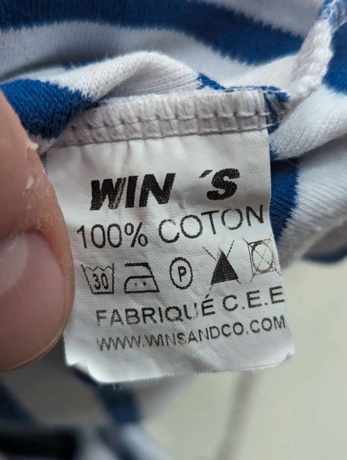 Marinière blanche à rayures bleues de marque Win's, en coton épais. Taille 12 mois, assez large. Très bon état D'autres vêtements bébé à vendre dans dressing #12moisDLau : n'hésitez pas à faire des lots pour amortir les frais de port et activer les réductions 😉