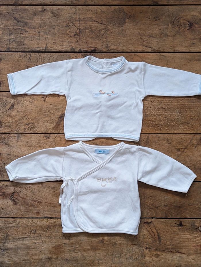 Lot de 2 brassières blanches, motifs discrets, taille naissance #NaissanceDLau : - 1 brassière à fermeture croisée de marque Hema à nouer - 1 brassière avec pressions au dos, de marque Marty Très bon état D'autres vêtements bébé #NaissanceDLau à vendre sur mon profil : n'hésitez pas à faire des lots pour amortir les frais de port !