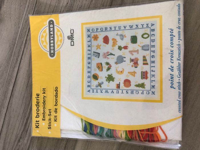 Kit complet de point de croix compté, représentant un abécédaire. Contenu du kit: des fils à broder DMC 100% coton, une aiguille, une toile à broder en coton, un diagramme du modèle. Taille motif: 28*28cm