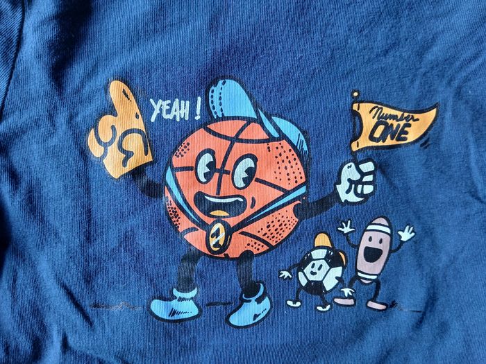 T-shirt à manches longues bleu marine, thème basketball. Marque Kiabi. Taille 3 ans / 90 - 97 cm Très bon état, très peu porté