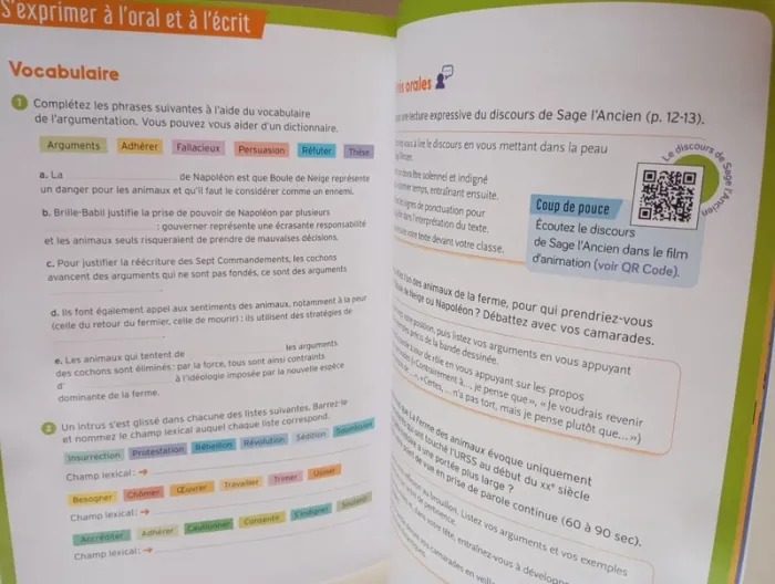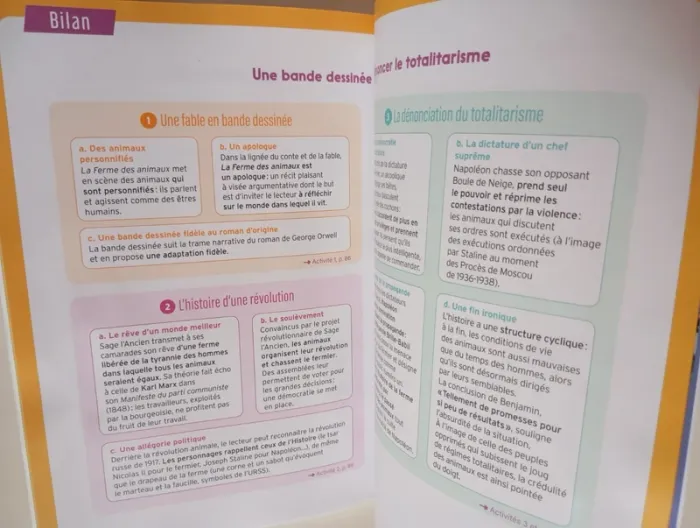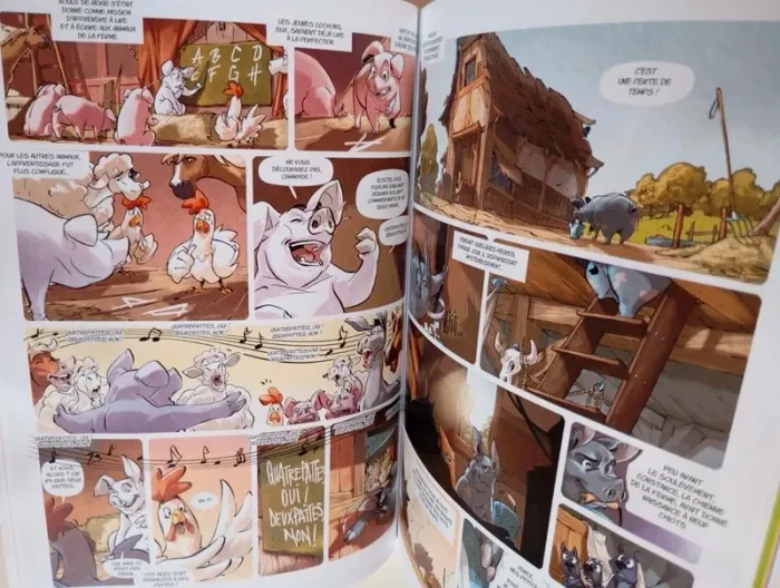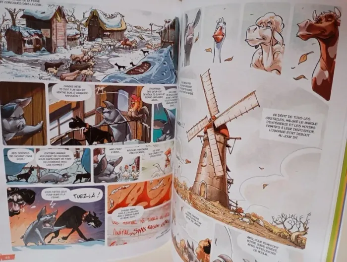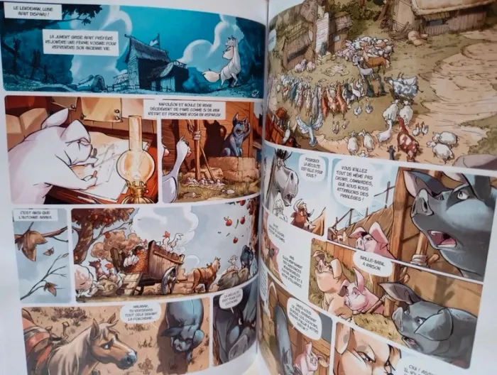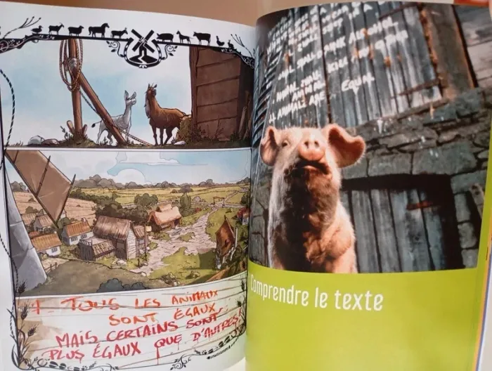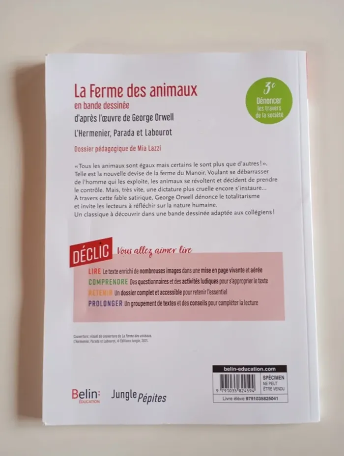 Scénario de Maxe L'Hermenier, adaptation de Thomas Labourot d'après l'oeuvre de George Orwell, illustrations de Diego L. Parada. Dossier pédagogique de Mia Lazzi. « Tous les animaux sont égaux mais certains le sont plus que d'autres ! ». Telle est la nouvelle devise de la ferme du Manoir. Voulant se débarrasser de l'homme qui les exploite, les animaux se révoltent et décident de prendre le contrôle. Mais très vite, une dictature plus cruelle encore s'instaure... À travers cette fable satirique, George Orwell dénonce le totalitarisme et invite les lecteurs à réfléchir sur la nature humaine. Un classique à découvrir dans une bande dessinée adaptée aux collégiens ! LIRE Le texte adapté en bande dessinée COMPRENDRE Des questionnaires et des activités ludiques pour s'approprier le texte RETENIR Un dossier complet et accessible pour retenir l'essentiel PROLONGER Un groupement de textes et des conseils pour compléter la lecture ACCOMPAGNER De nombreux compléments numériques pour aider les élèves dans la lecture (des extraits vidéo à visionner sur Internet, une versions epub de l'ouvrage disponible dans les librairies numériques). Éditeur ‏ : ‎ BELIN EDUCATION 96 pages Dimensions ‏ : ‎ 16 x 1.1 x 22 cm Livre en excellent état Je vends d'autres livres de la même collection #phil_peg_déclic #fermedesanimaux #dossierpédagogique