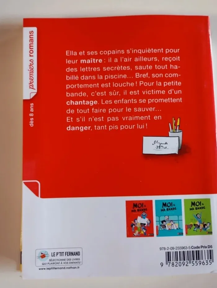 Bêtises et délires garantis avec Ella et ses amis ! Un roman illustré, facile à lire tout seul et à comprendre. Une histoire rythmée et passionnante qui donne vraiment envie de lire. L'histoire : Ella et ses copains s'inquiètent pour leur maître : il a l'air ailleurs, reçoit des lettres secrètes en classe, saute dans l'eau tout habillé à la piscine... Bref, son comportement est louche ! Or, ses élèves, eux, ont beaucoup d'imagination. Ils vont tout mettre en œuvre pour le sauver... même s'il n'est pas vraiment en danger ! Éditeur ‏ : ‎ Nathan 120 pages Âge de lecture ‏ : ‎ 7 - 10 ans Dimensions ‏ : ‎ 14.7 x 1.2 x 19.2 cm Livre en excellent état Je vends d'autres premiers romans #phil_peg_premiersromans #école #maitre