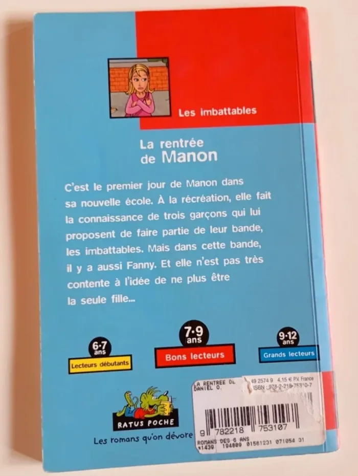C'est le premier jour de Manon dans sa nouvelle école. A la récréation, elle fait la connaissance de trois garçons qui lui proposent de faire partie de leur bande, les imbattables. Mais dans cette bande, il y a aussi Fanny. Et elle n'est pas très contente à l'idée de ne plus être la seule fille. Éditeur ‏ : ‎ Editions Hatier 61 pages Âge de lecture ‏ : ‎ 6 - 8 ans Dimensions ‏ : ‎ 11.5 x 0.4 x 18 cm Livre en très bon état #phil_peg_école #rentrée #école #ratuspoche