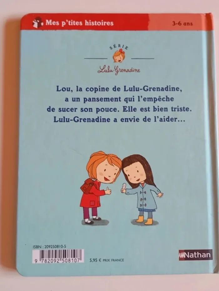Lou, la copine de Lulu-Grenadine, est toute triste car elle a un pansement qui l'empêche de sucer son pouce. Que pourrait bien inventer Lulu-Grenadine pour la consoler? Éditeur ‏ : ‎ Nathan Jeunesse 24 pages Âge de lecture ‏ : ‎ 3 - 6 ans Dimensions ‏ : ‎ 16 x 1 x 21 cm Livre en très bon état #pouce #autonomie #école