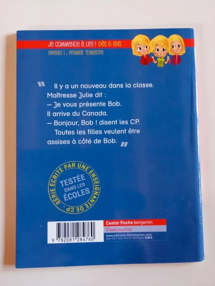 Écrite par Magdalena, enseignante 16 ans en CP et auteure jeunesse depuis de nombreuses années, la collection Je suis en est spécialement conçue pour accompagner les enfants dans leur apprentissage de la lecture. Le texte, écrit gros, est adapté au niveau de lecture, avec les lettres muettes grisées. La mise en page est aérée, les illustrations nombreuses bien distinctes du texte pour ne pas gêner la lecture. Un nouvel élève arrive dans la classe de CP ! Il s’appelle Bob, il vient du Canada et a un drôle d’accent. Toutes les filles veulent être assises à côté de lui, ce qui déclenche un peu de jalousie… Vivement la récré que les garçons puissent jouer avec lui ! Éditeur ‏ : ‎ PERE CASTOR 40 pages Âge de lecture ‏ : ‎ 6 - 8 ans Dimensions ‏ : ‎ 14.8 x 0.6 x 19.4 cm Livre en très bon état Je vends d'autres livres premières lectures #phil_peg_premiereslectures, #phil_peg_jesuisencp, #phil_peg_école #cp #apprentissagelecture #école #nouveau