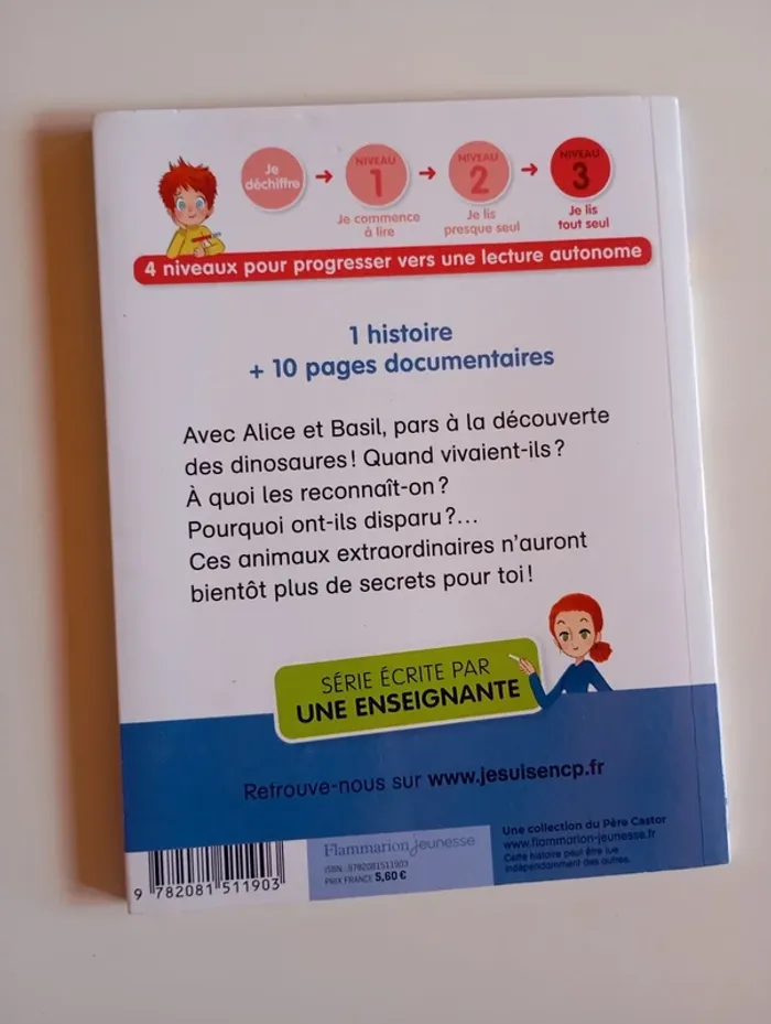 Avec Alice et Basil, pars à la découverte des dinosaures ! Quand vivaient-ils ? A quoi les reconnaît-on ? Pourquoi ont-ils disparu ?... Ces animaux extraordinaires n'auront bientôt plus de secrets pour toi ! Éditeur ‏ : ‎ PERE CASTOR 40 pages Âge de lecture ‏ : ‎ 6 - 7 ans Dimensions ‏ : ‎ 14.9 x 0.5 x 19.5 cm Livre en très bon état Je vends d'autres livre premières lectures #phil_peg_premiereslectures, #phil_peg_jesuisencp, #phil_peg_dinosaures #jesuisencp #dinosaures