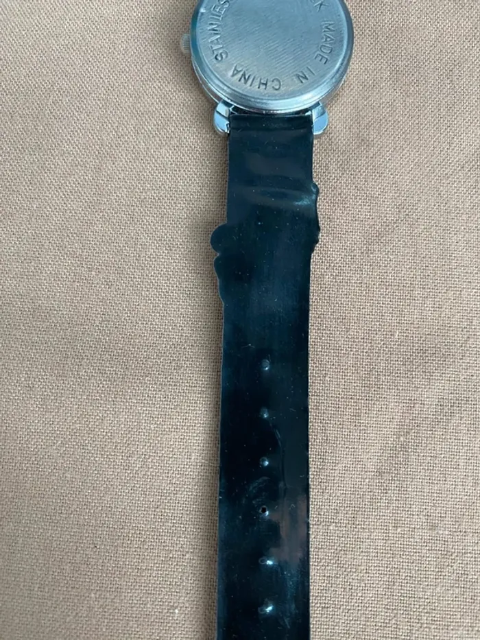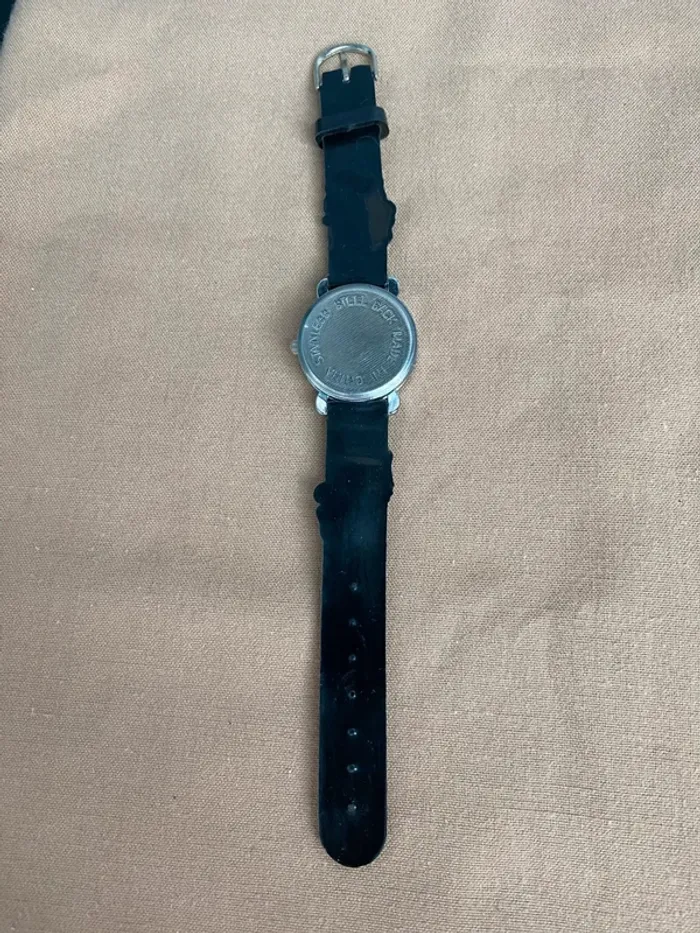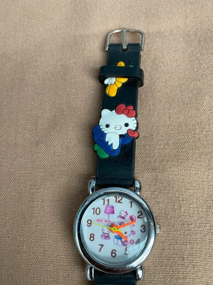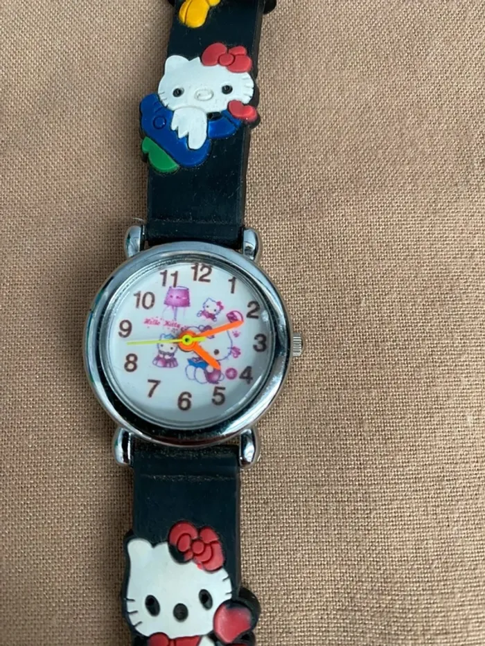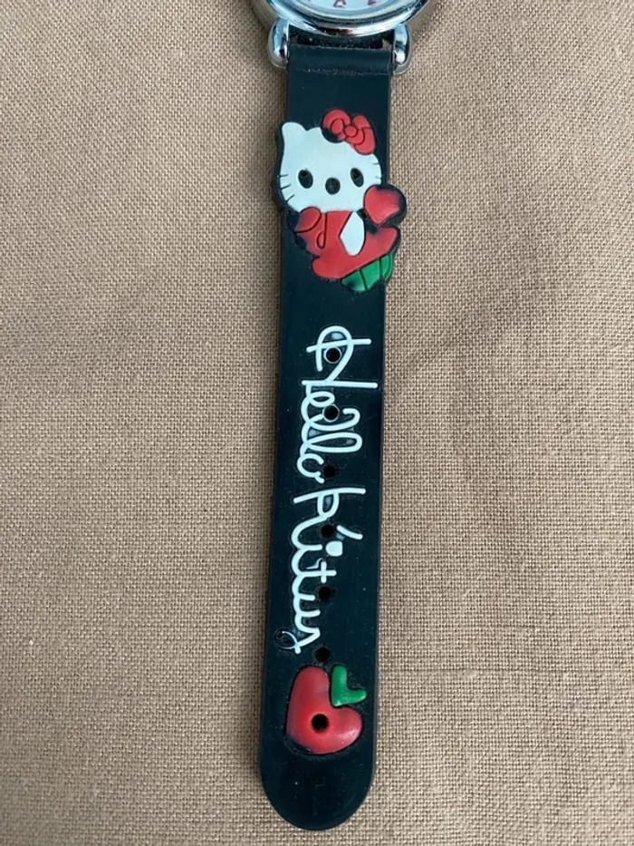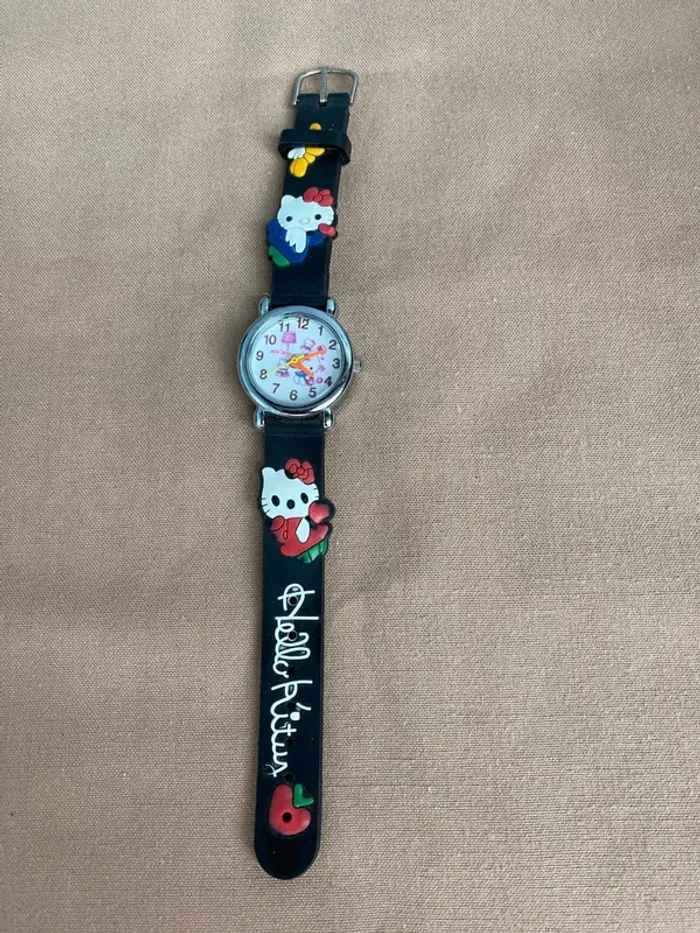 Vends Montre Hello Kitty noir bracelet en plastique en bon état plusieurs traces d'utilisation il faudra changer la pile