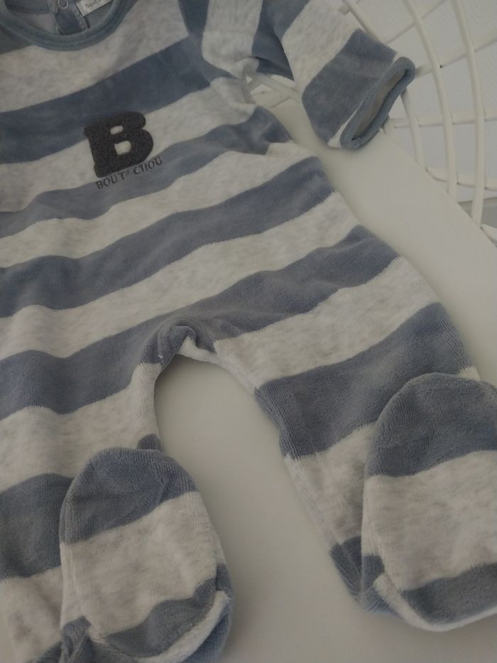 Pyjama velours à rayures bleu et gris, marque Bout’Chou, taille 6 mois. Manches longues, pieds intégrés, motif brodé "B – Bout’Chou" sur la poitrine. 👶 Confortable et doux, idéal pour la mi-saison et l’hiver. 📌 Bon état.