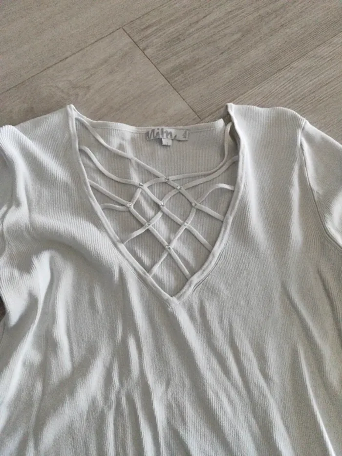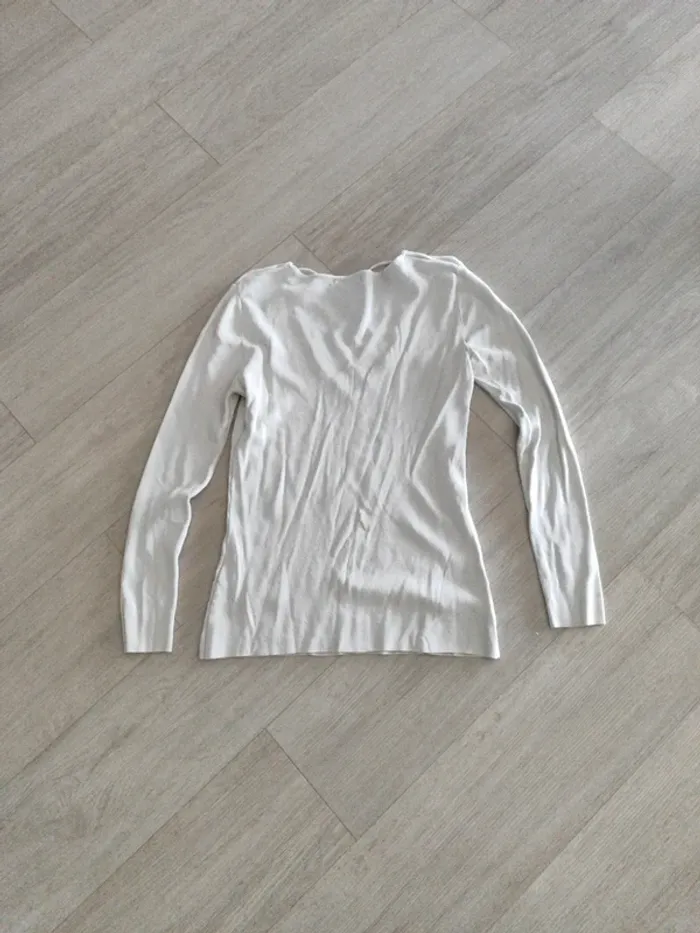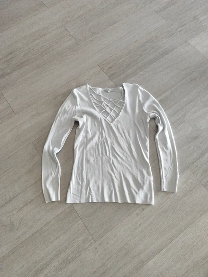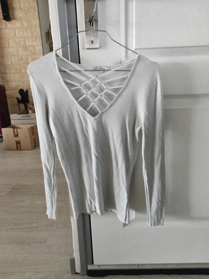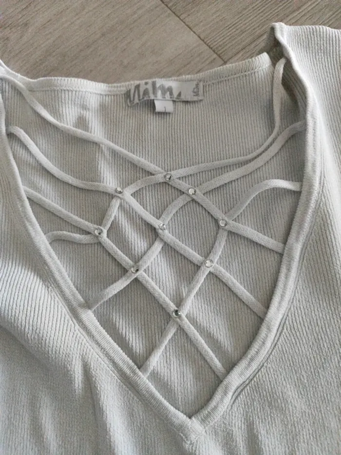 Pull blanc gris. Taille 1 Marque mim. Légèrement ouvert sur le devant avec paillettes