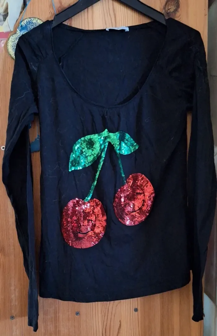 Tee shirt motif cerise en sequins taille S en très bon état "cache cache"