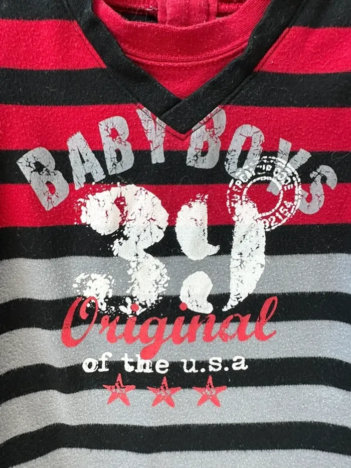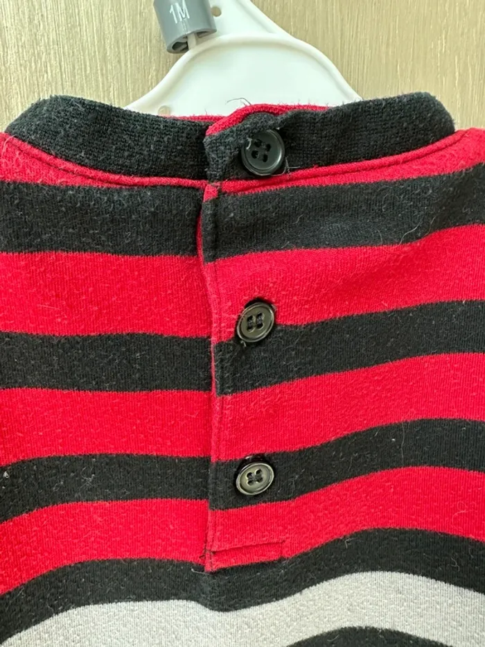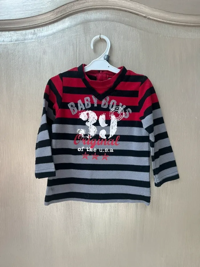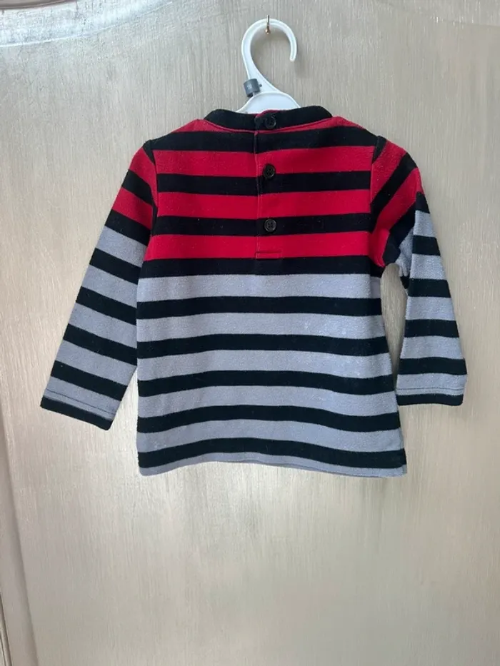 Vends T-shirt manche longue rayé rouge noir et gris 12 mois en bon état
