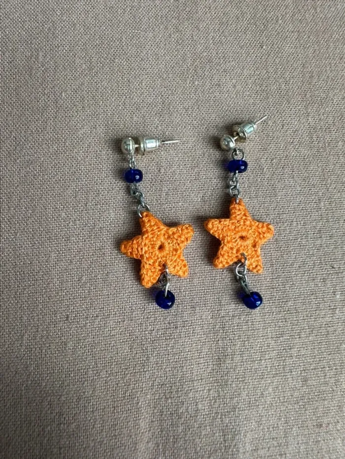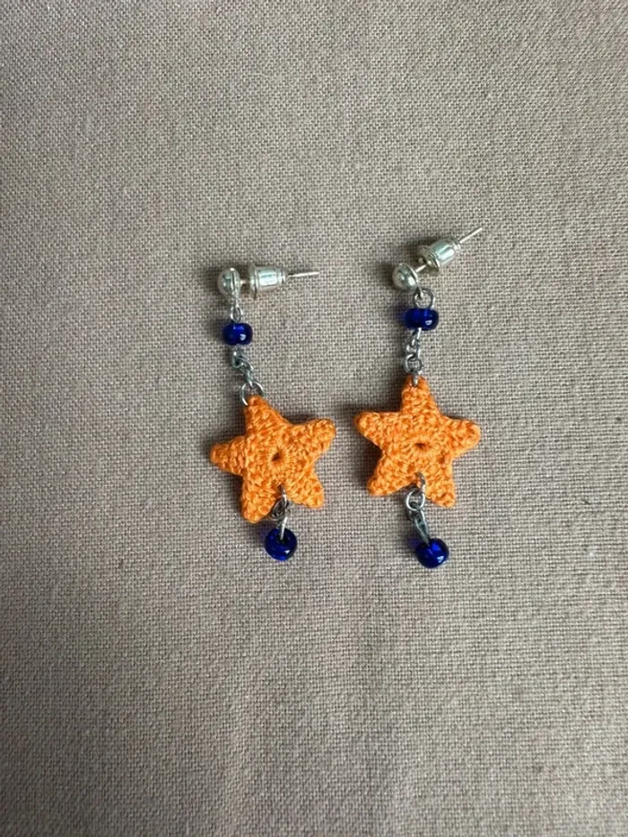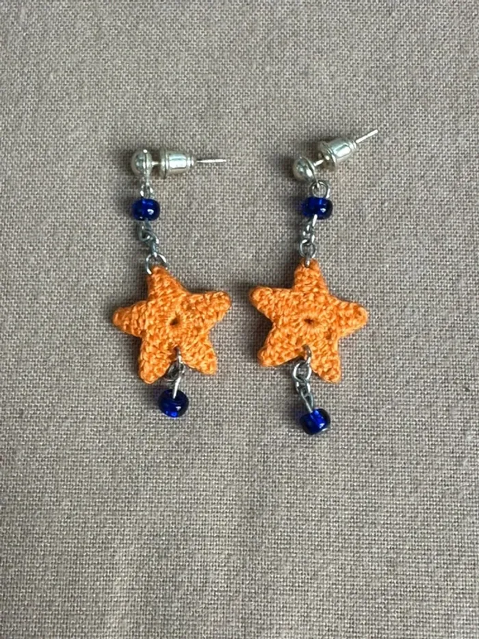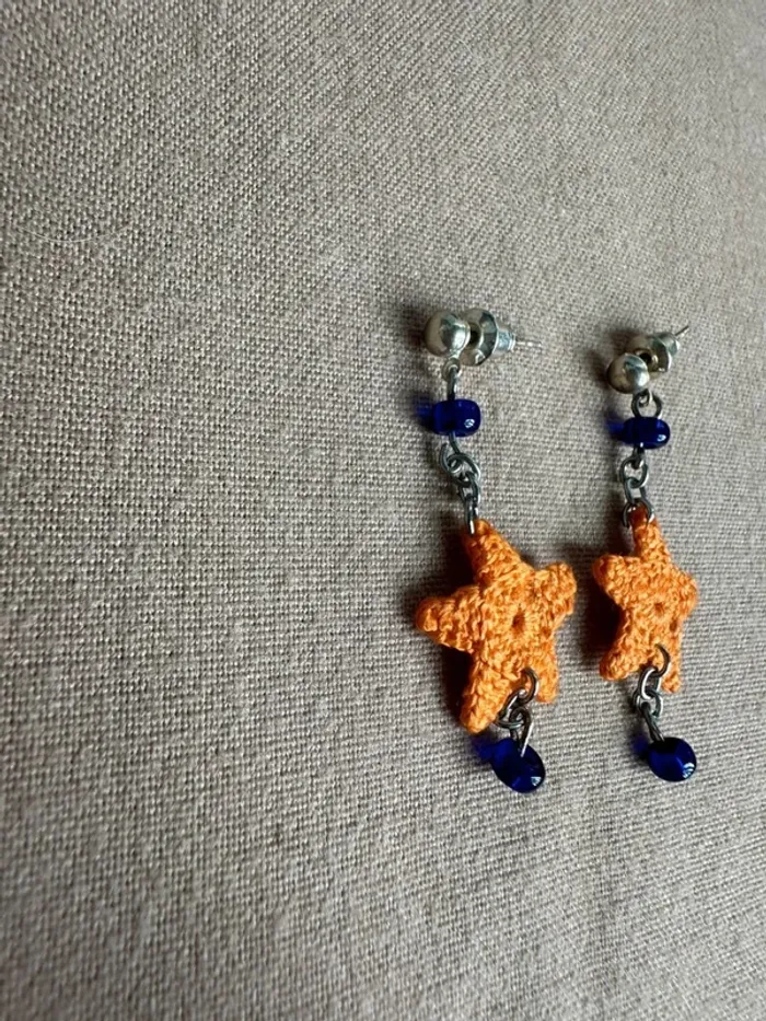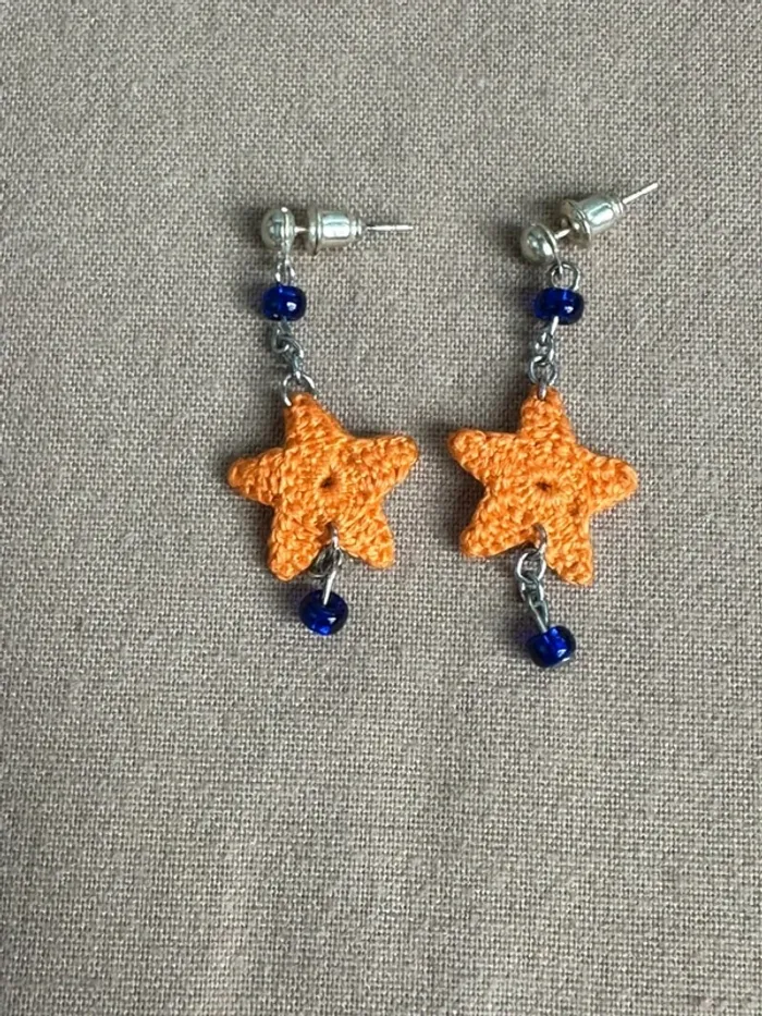 Vends Boucles d'oreille étoile orange au crochet et petit strass bleu