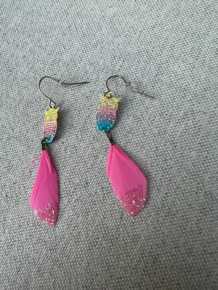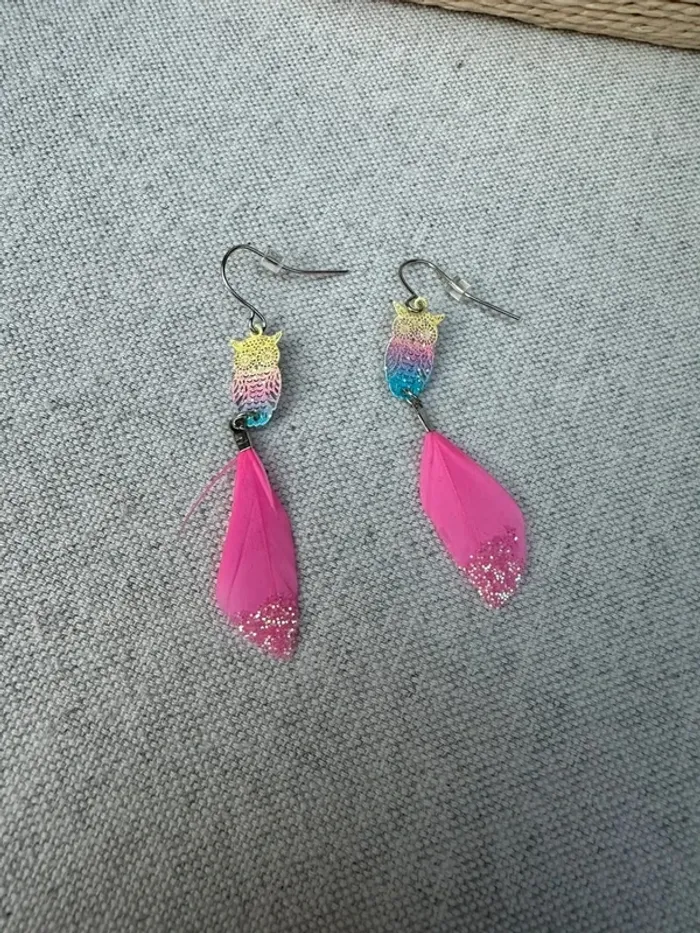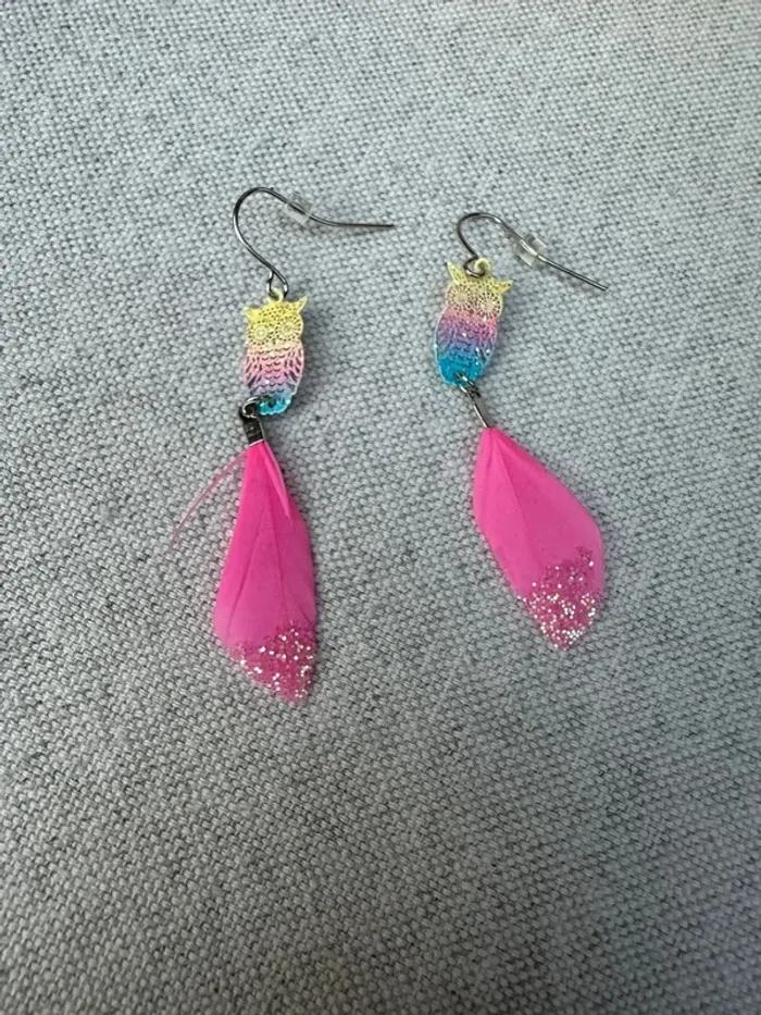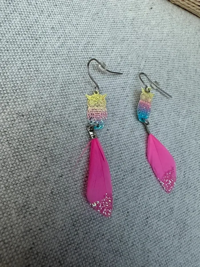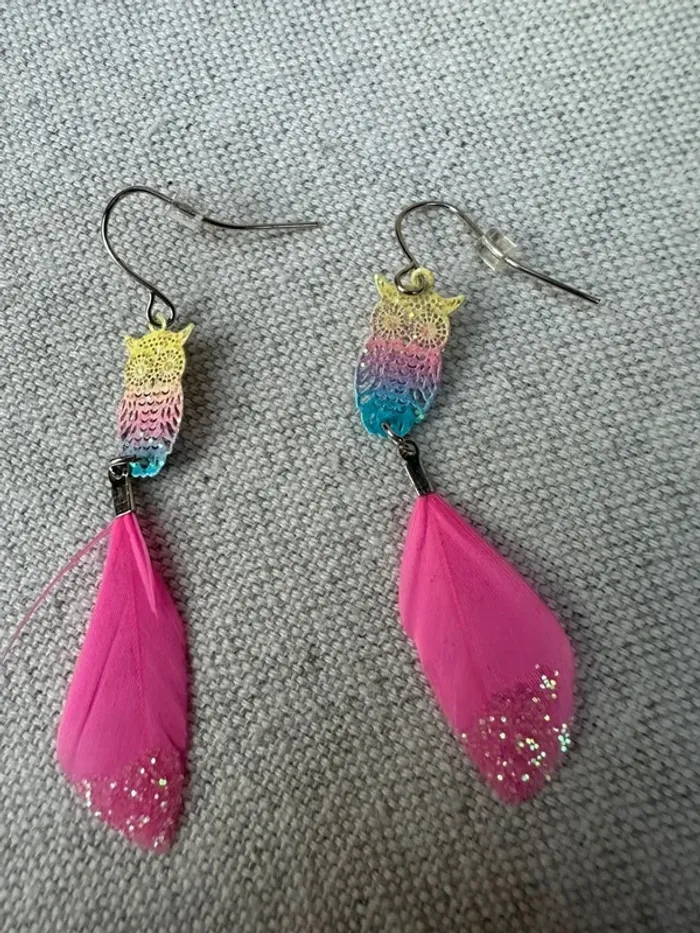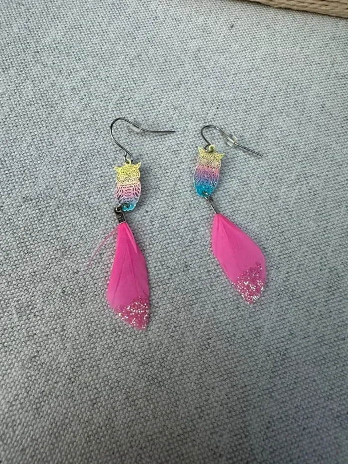Vends Boucles d'oreilles hiboux et plume rose en très bon état Très peu porté