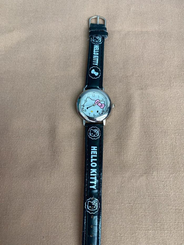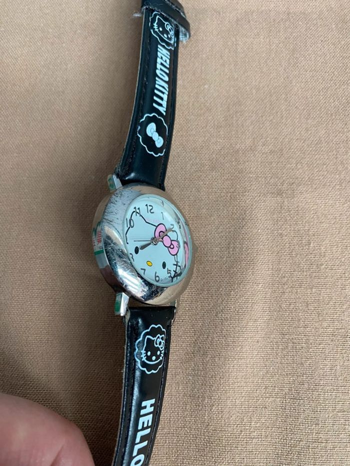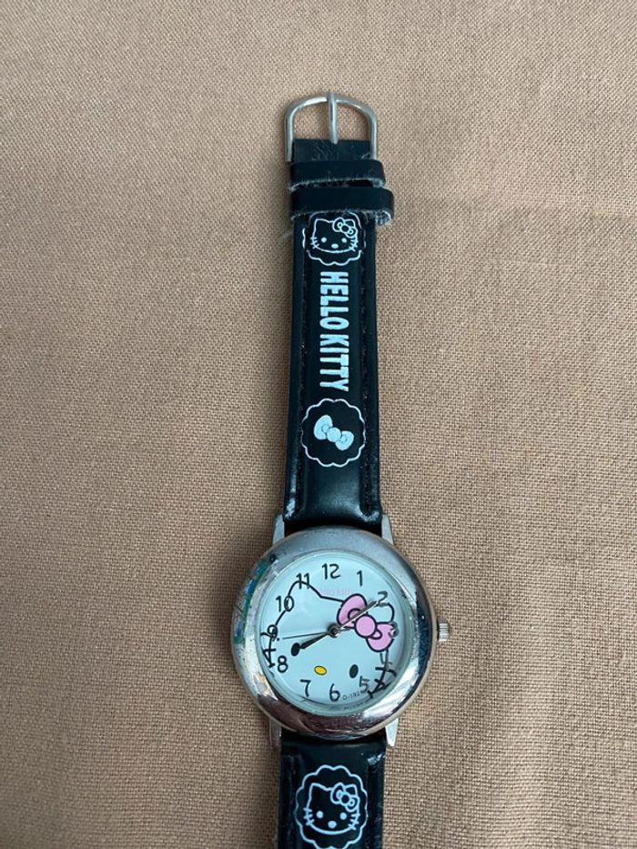 Vends Montre Hello Kitty noir bracelet en aspect cuir en bon état utilisé plusieurs fois il faudra changer la pile