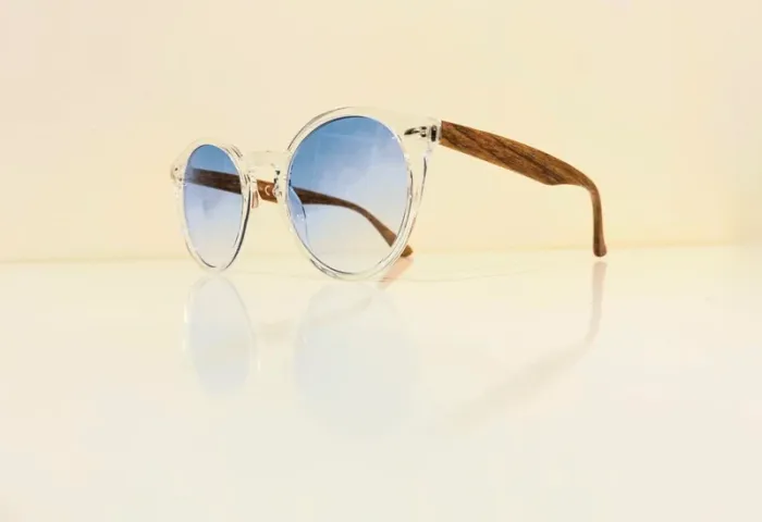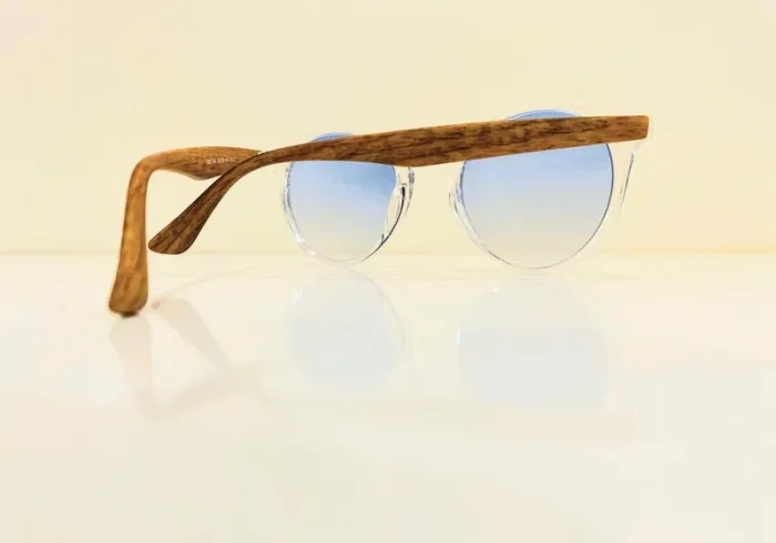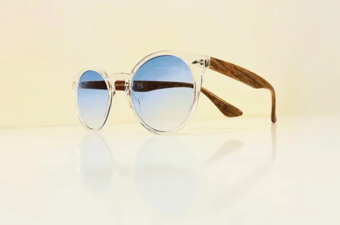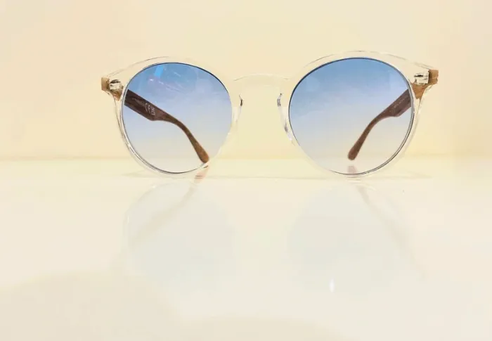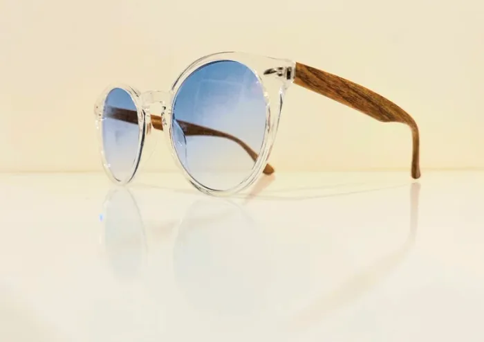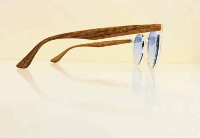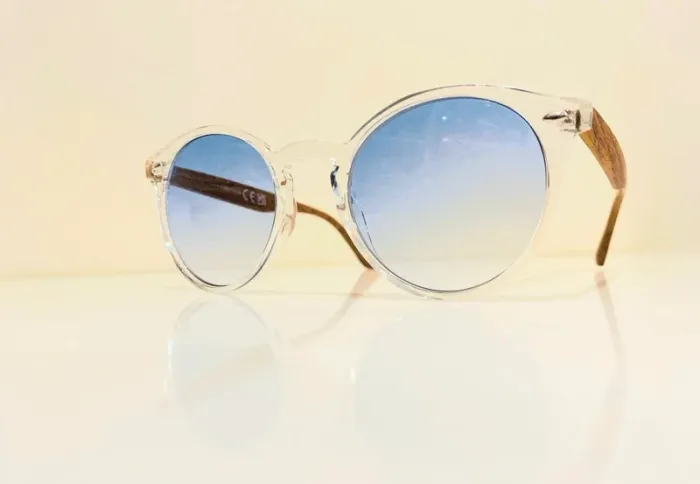 Lunette de soleil mixte transparente verres bleus dégradés bras effet bois UV protection catégorie 1