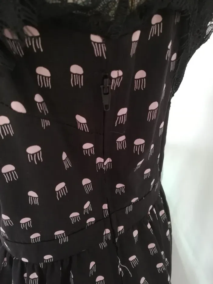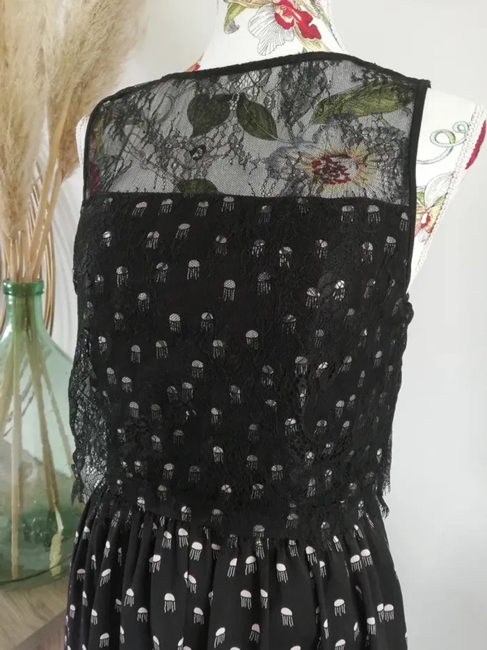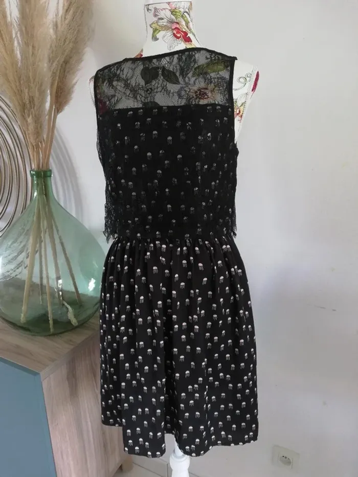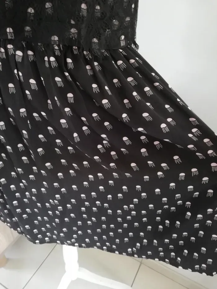 Je vends cette robe de la marque NAF NAF en très bon état. Dentelle noire sur le haut Motifs méduses Couleur noire avec méduse rose claire Zip sur le côté T38 100% Polyester Longueur 87cm largeur d'aisselle à aisselle 46 cm #robe #robenafnaf #nafnaf #robemeduse #robemedusenafnaf #robeete