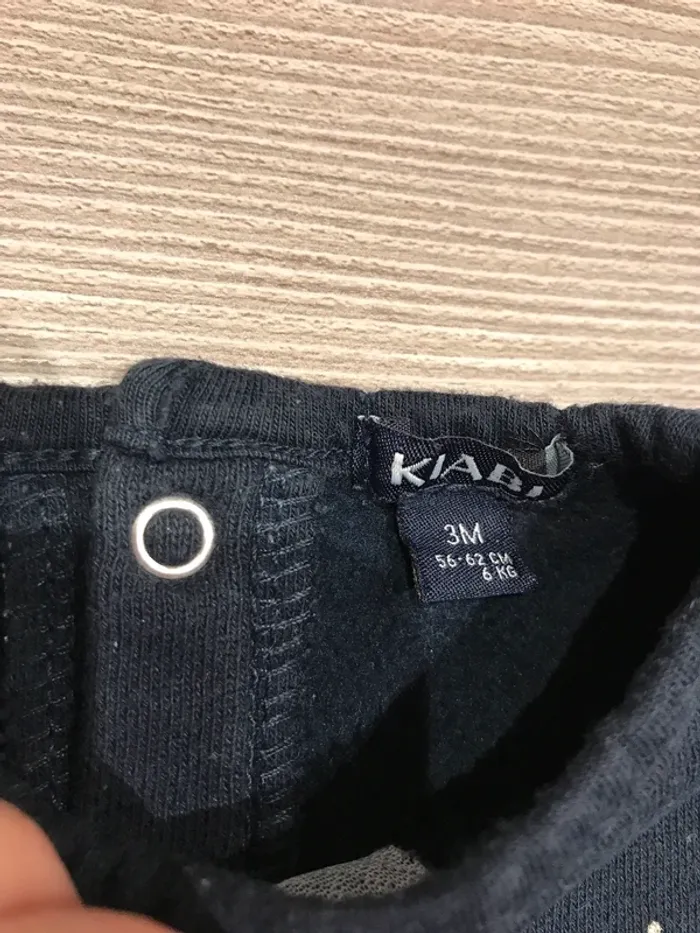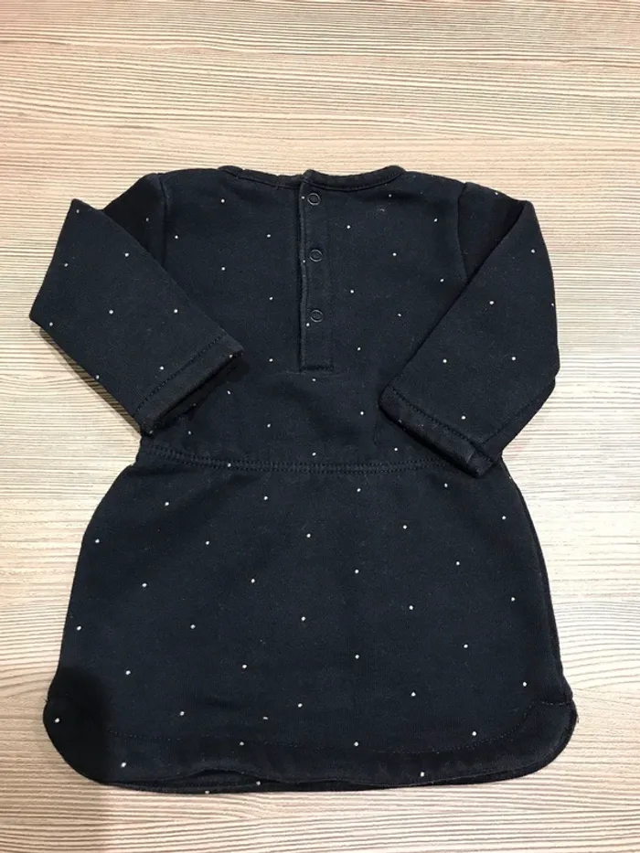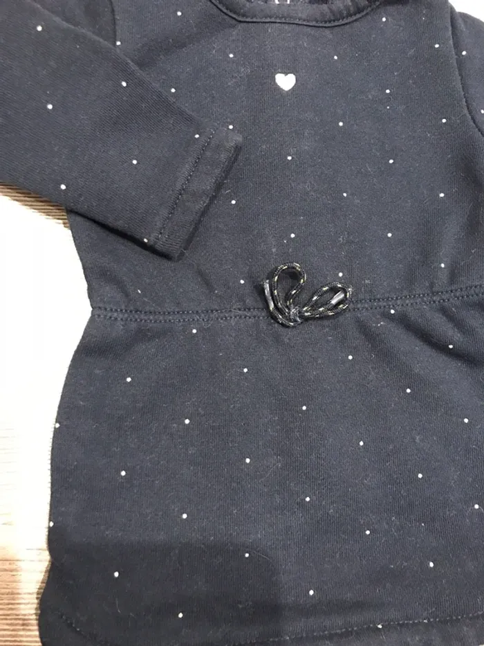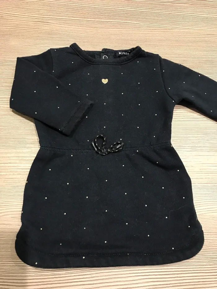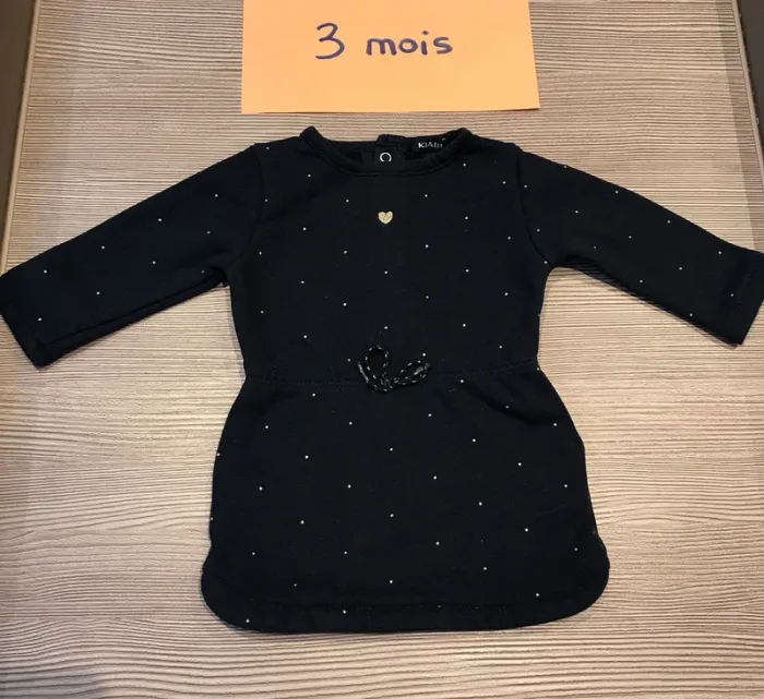 Robe bleu marine avec coeur doré et petits pois 3 mois Kiabi. Le coloris est bleu marine mais difficile à rendre sur les photos.