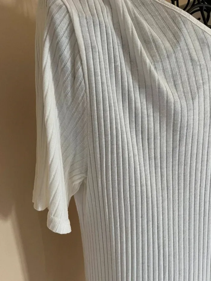 À mailles côtelées et en coton,polyester Indiqué en 44-60 D’épaule à épaule 51 cm D’aisselle à aisselle 60 cm Longueur 82 cm Ouverture fente des côtés