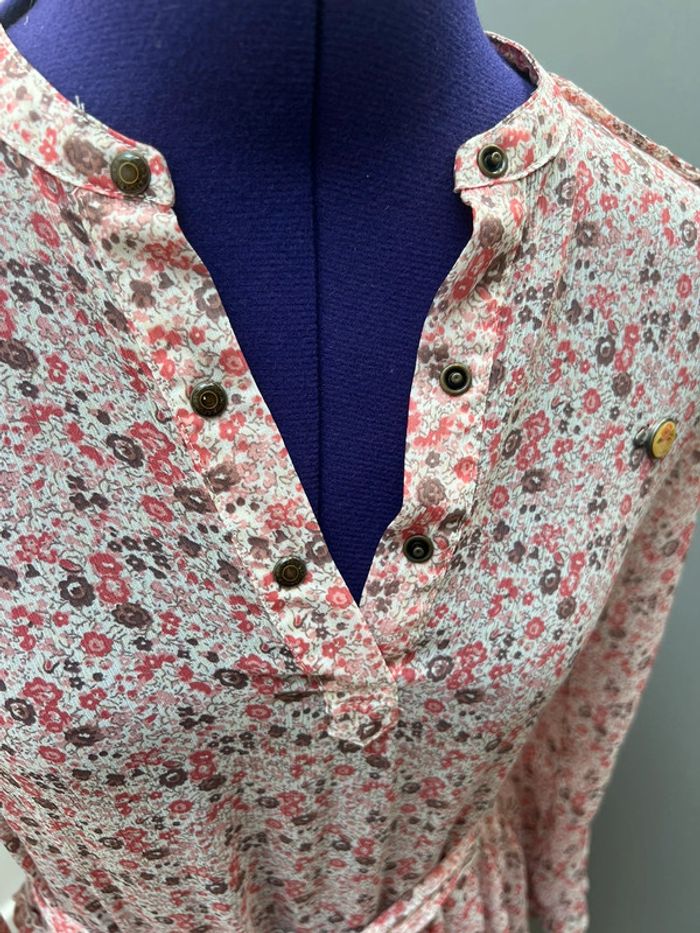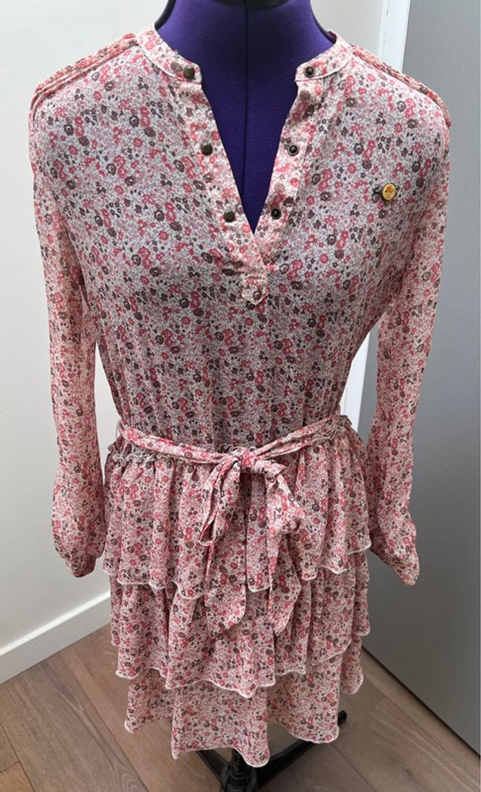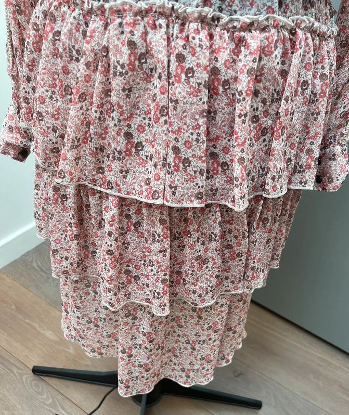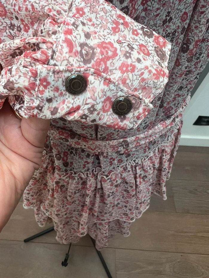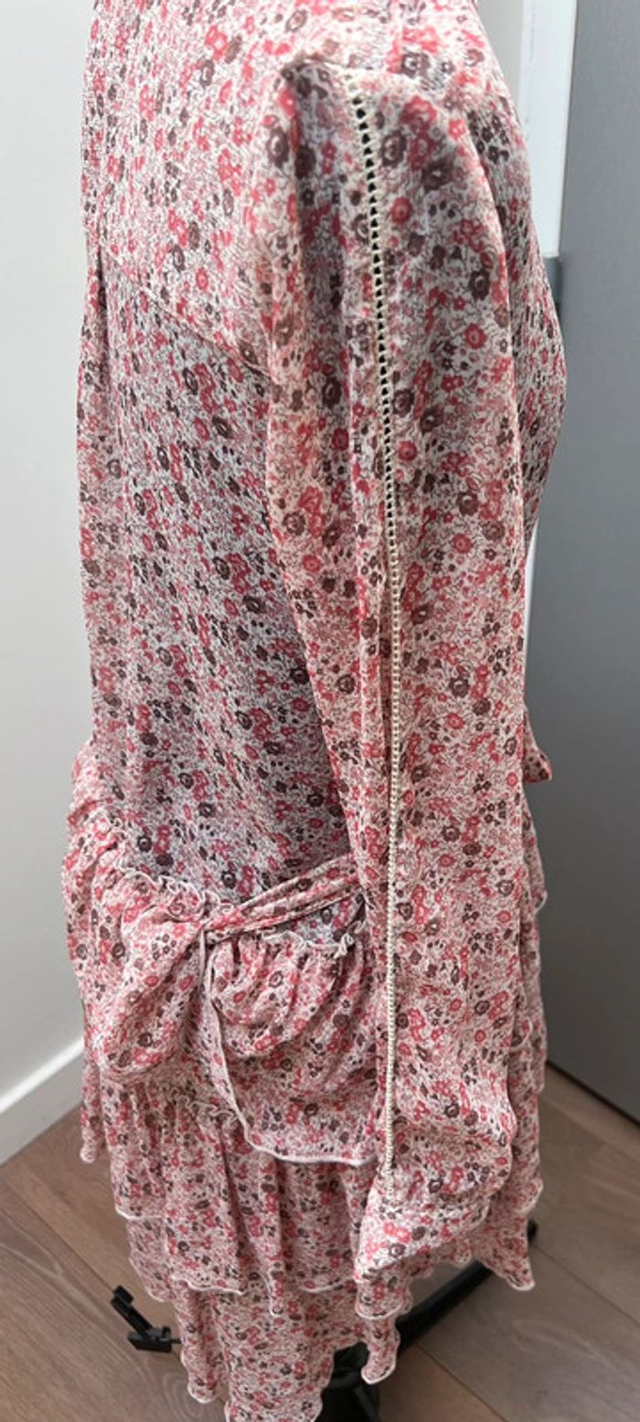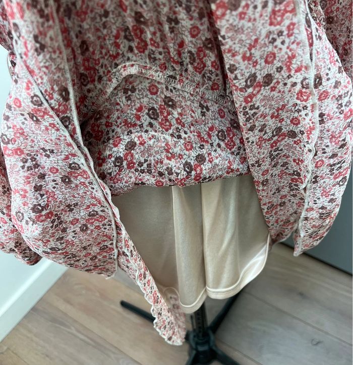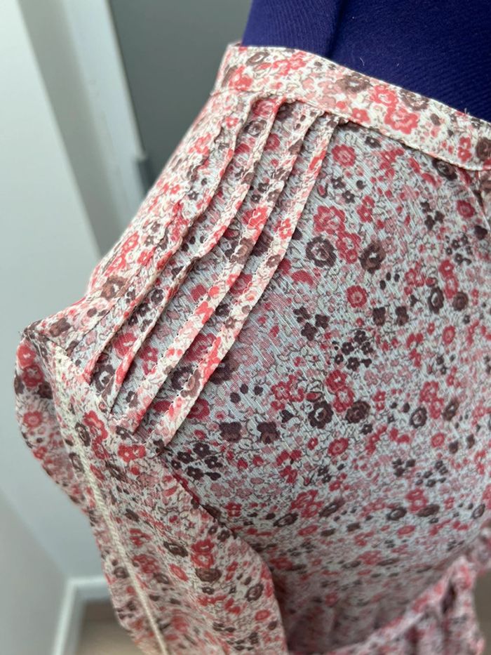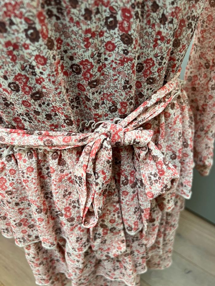 Robe légère à volants imprimé Liberty Doublure intégrée au niveau de la jupe Ceinture assortie Jolis détails ajourés au niveau des manches Portée une fois