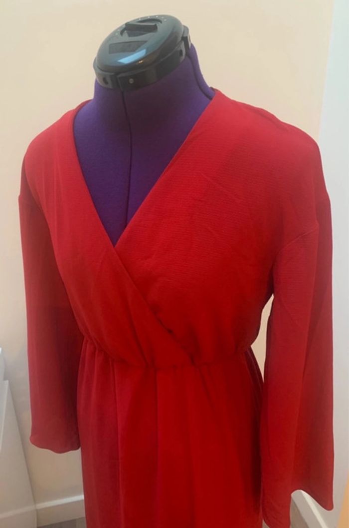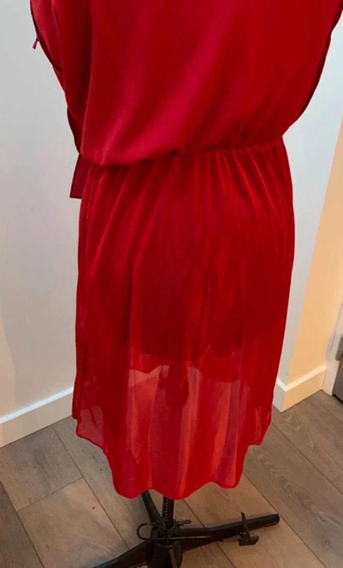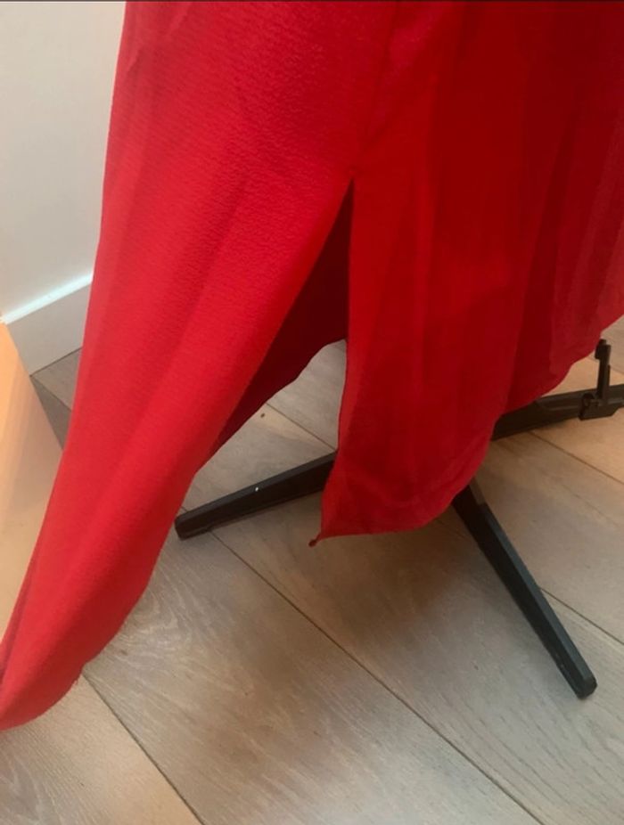 Robe longue légèrement fendue sur les deux côtés. cintrée à la taille par élastique, parfait pour rajouter une petite ceinture ou se porte également sans Non transparente (possède une doublure voir dernière photo) Buste forme cache cœur maintenu par un petit bouton pression invisible Prix d’origine 60€p Taille XS mais peut convenir à un petit 36
