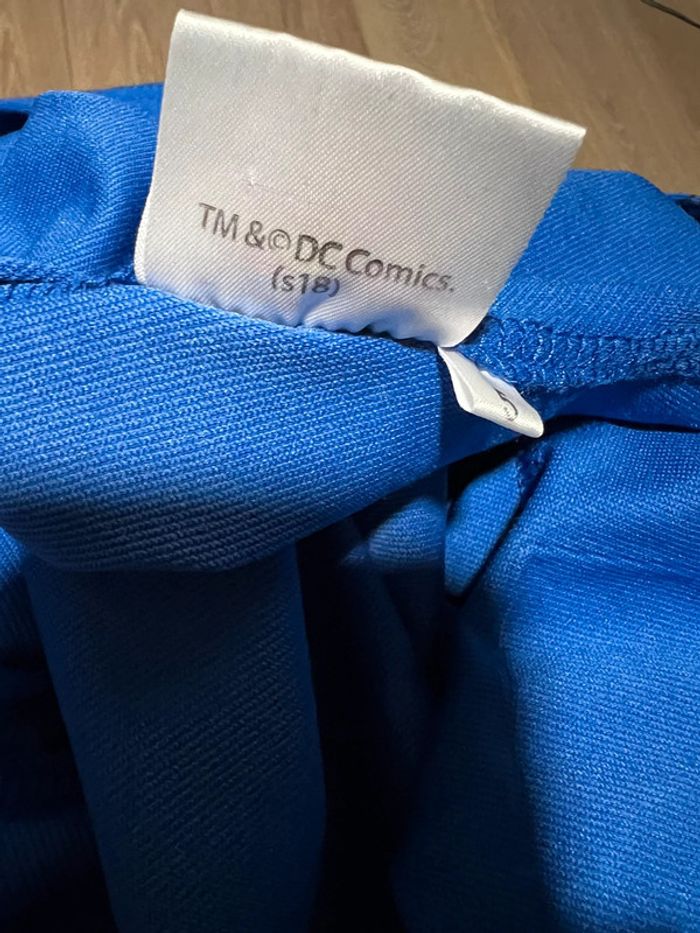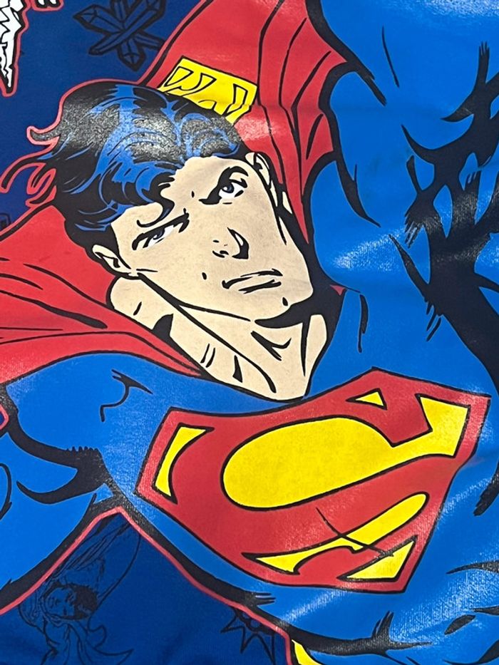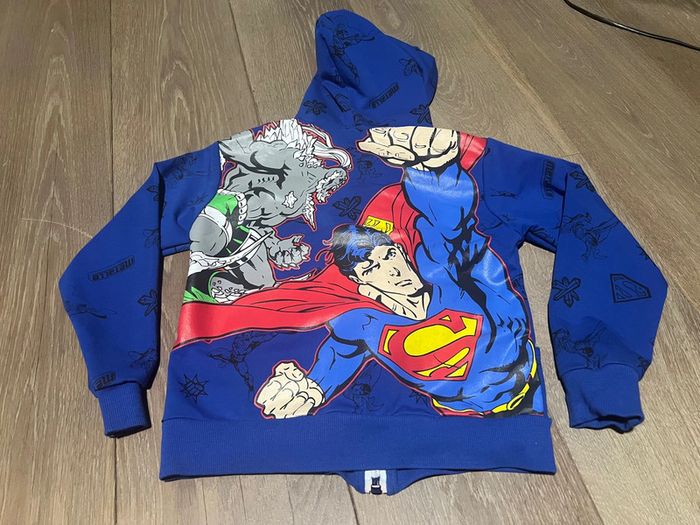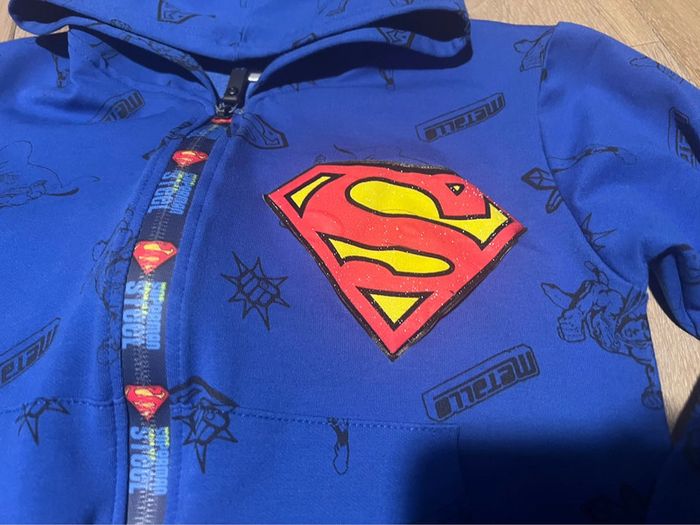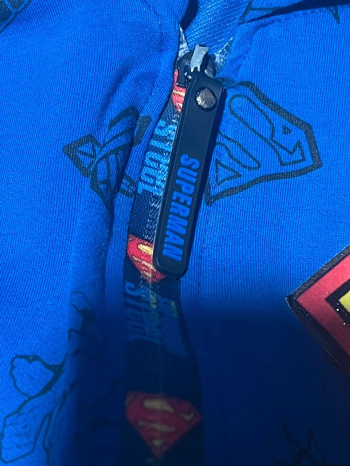 Veste à capuche avec fermeture zippée Flocage intact Logo superman sur la poitrine qui possède un système qui permettait de le faire clignoter mais les piles doivent être usées et il n’y a aucun moyen de les remplacer sauf à découdre de l’intérieur