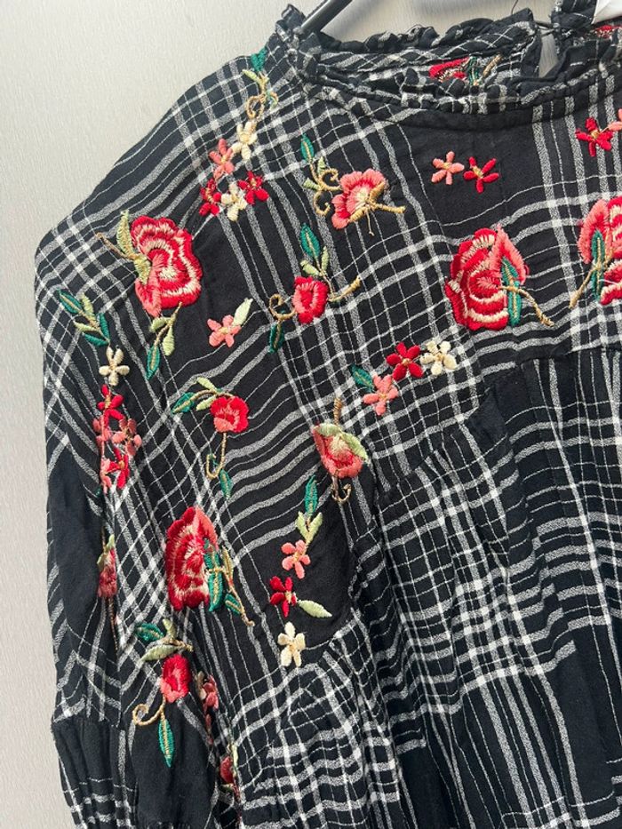 Chemise avec col haut froncé, manches longues, broderie florale à l'avant et à l'arrière, couture sous la poitrine et silhouette A-line. S’attache à l'arrière avec une ouverture boutonnée. Étiquette intérieure coupée mais il s’agit de 100% coton Taille S