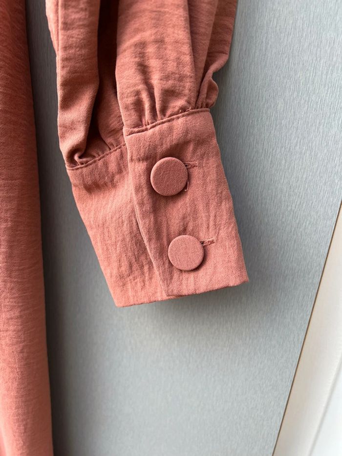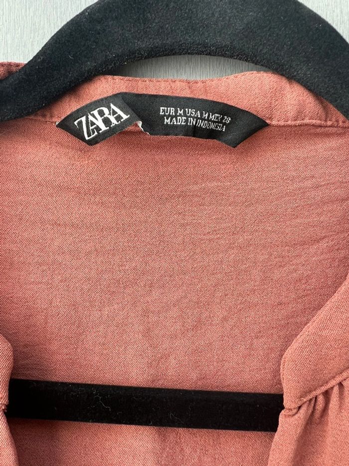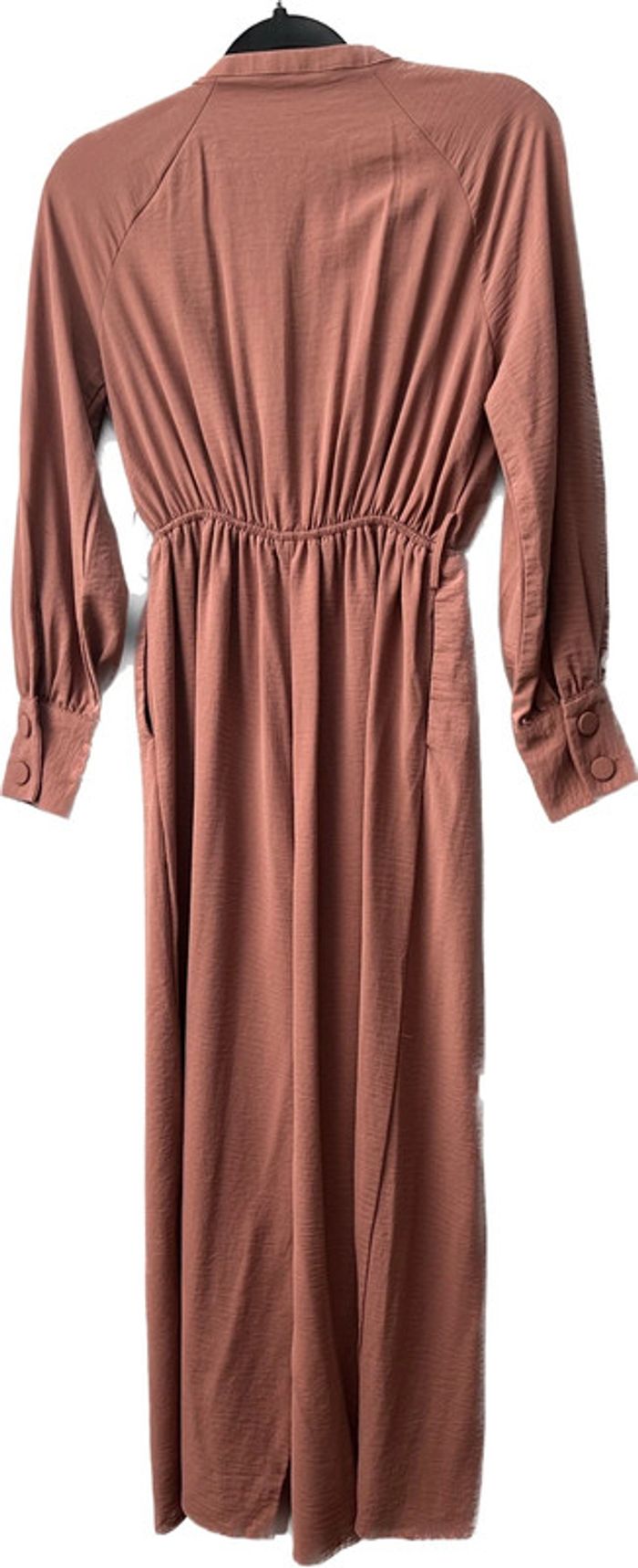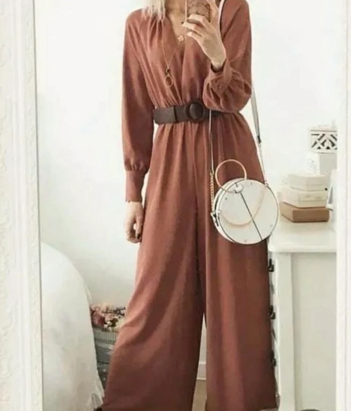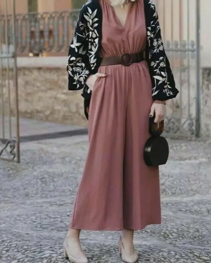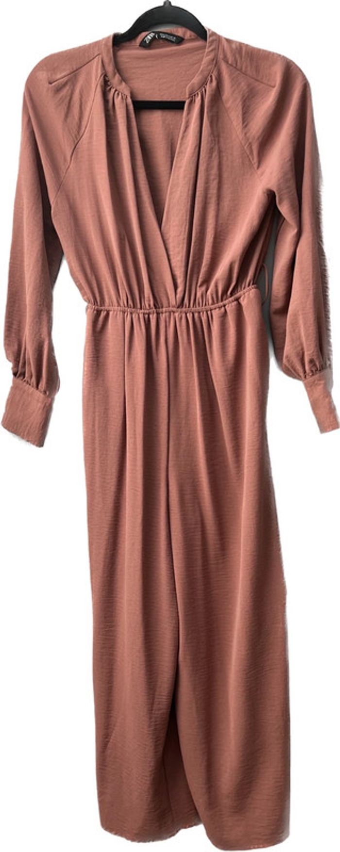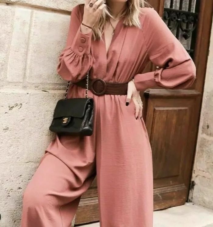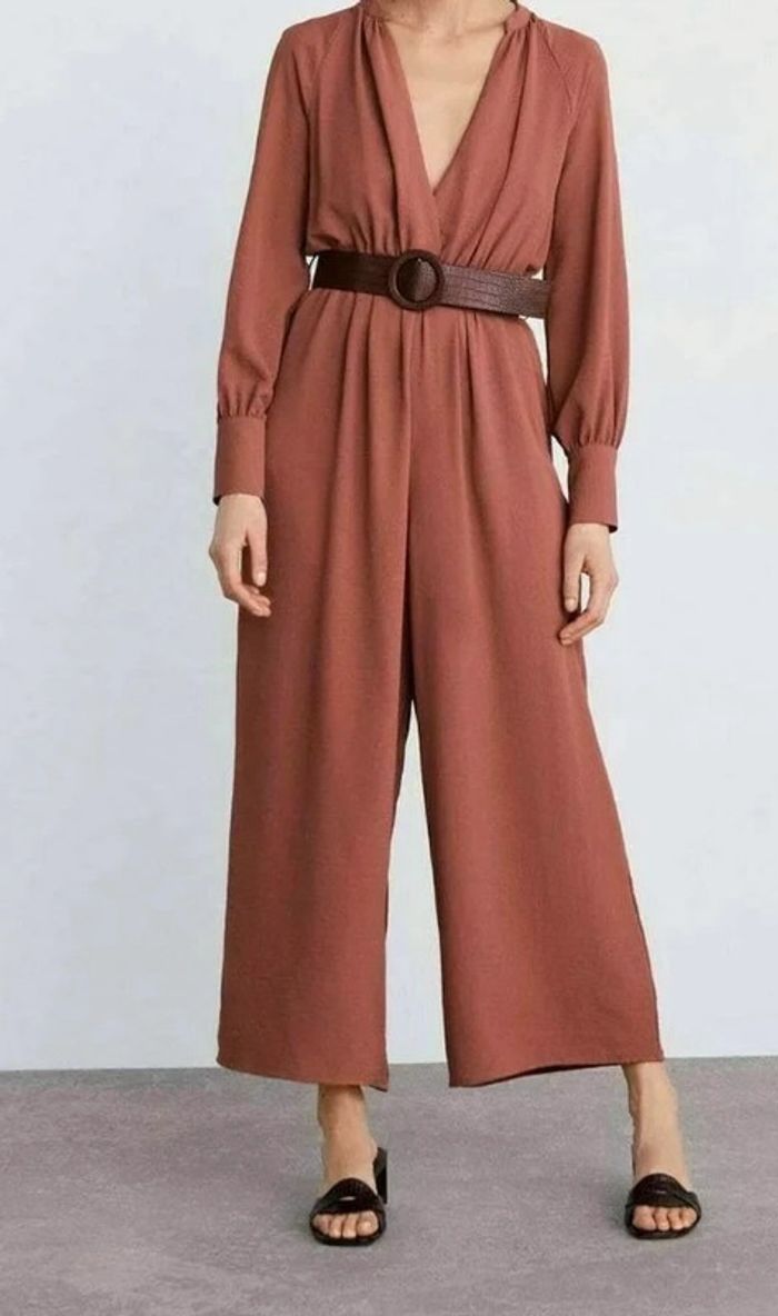 COMBINAISON FLUIDE ZARA RÉF. 2157/027 Combinaison fluide couleur vieux rose avec col à revers et col en V avec manches longues à poignets. Poches latérales cachées dans les coutures. Cintrée à la taille avec ceinture élastique. Passants pour une ceinture (non fournie) Jambes larges Complètement épuisé Vu sur les blogueurs de mode Excellent état, porté une fois