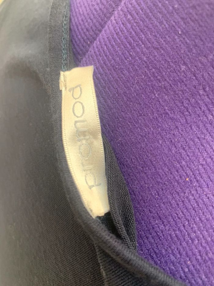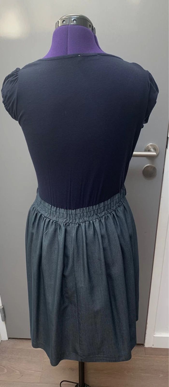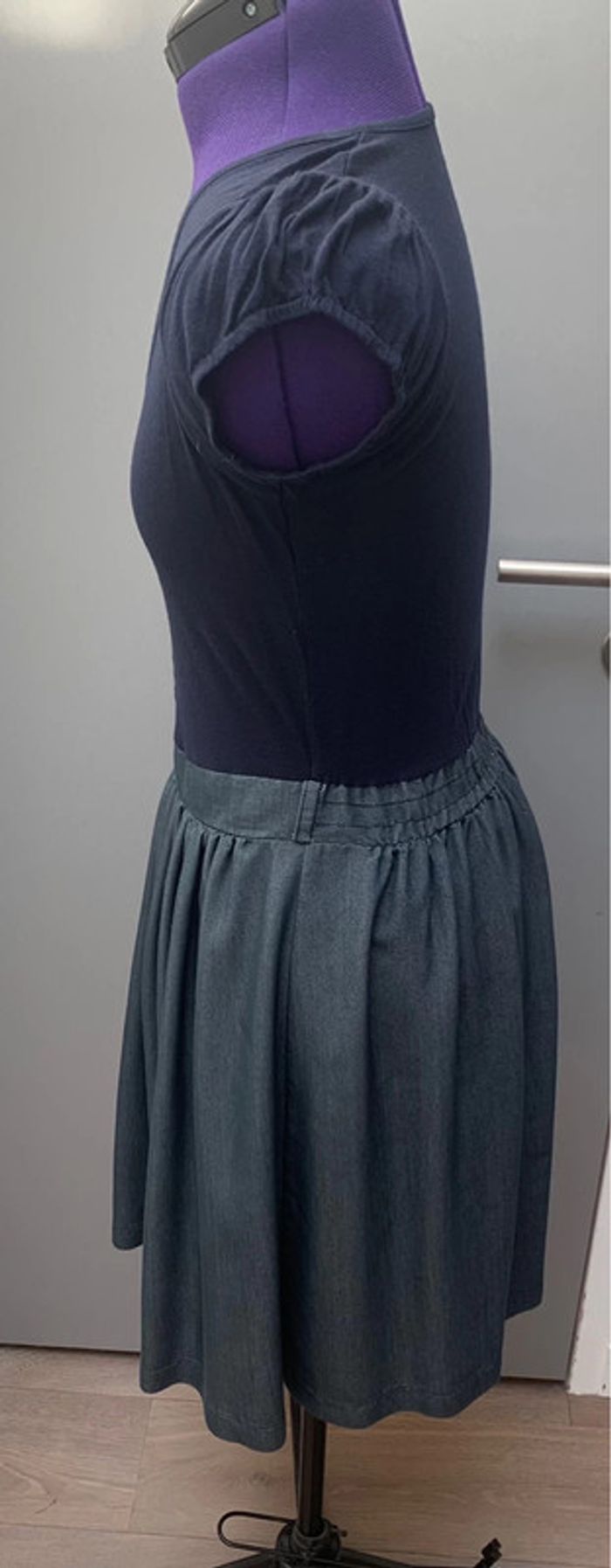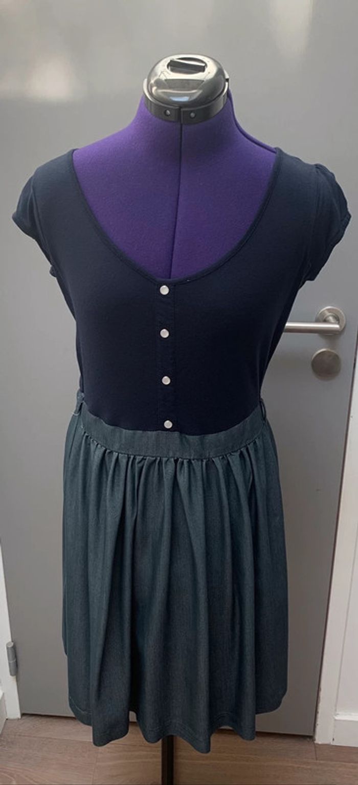Robe bi-matière Petits boutons sur le haut qui servent de décoration (le haut ne s’ouvre pas) Jupe patineuse Passants pour mettre une ceinture (non fournie) longueur épaule au bas de la robe: environ 90cm Haut bleu marine bas gris anthracite