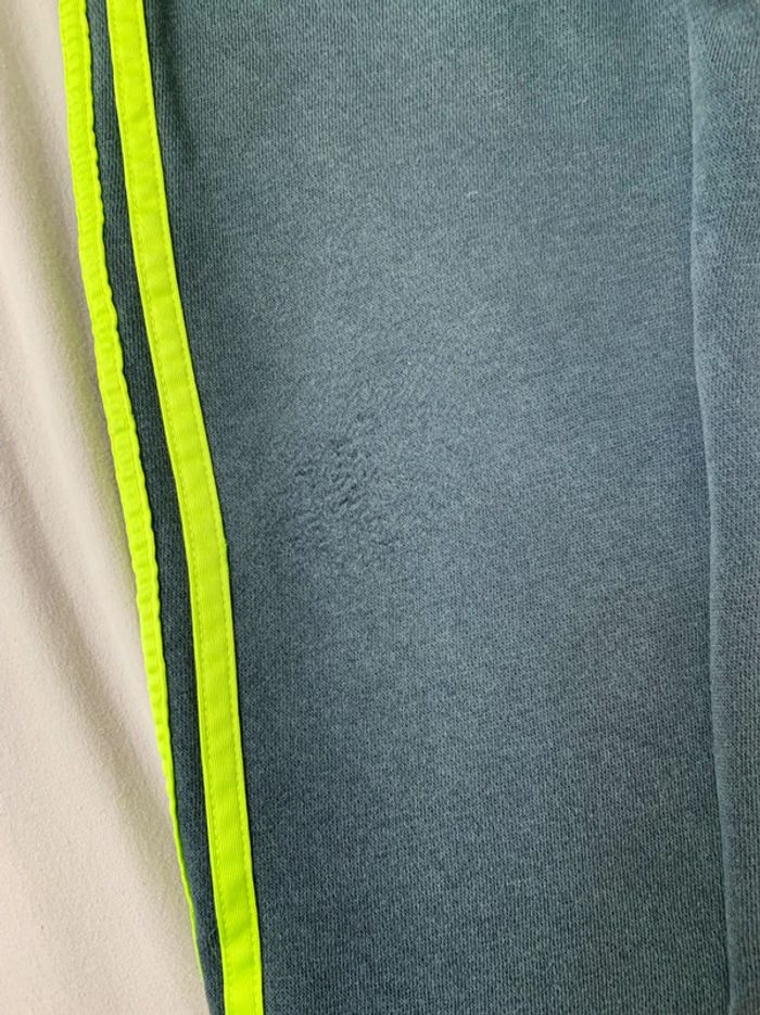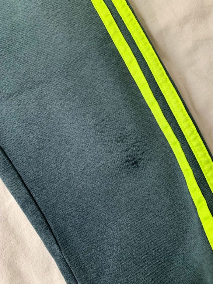Bas de jogging éraflures au niveau des genoux (voir photos) mais pas de trous Gris anthracite avec bandes vert anis fluo Taille 2/3 ans