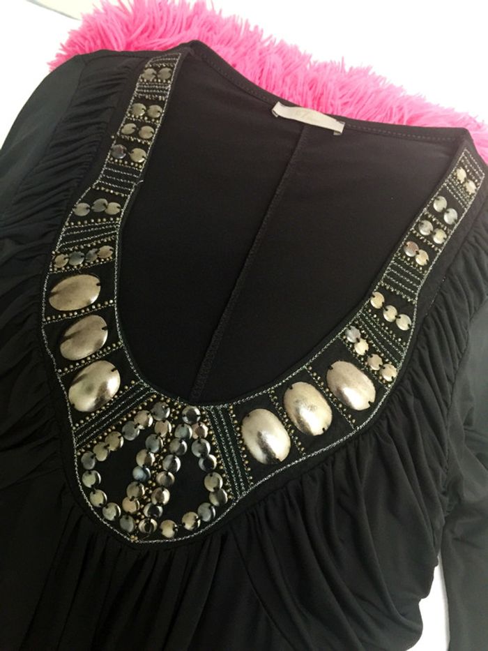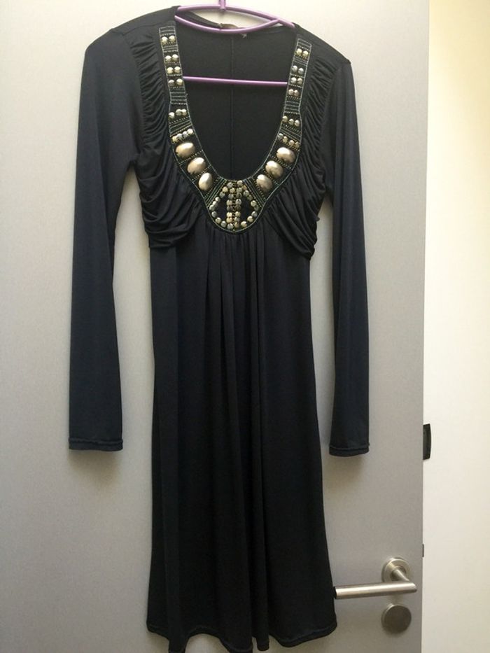 Matière très fluide Applications métalliques sur le décolleté Étiquette enlevée mais convient à un 36 ou 38 Longueur 95cm