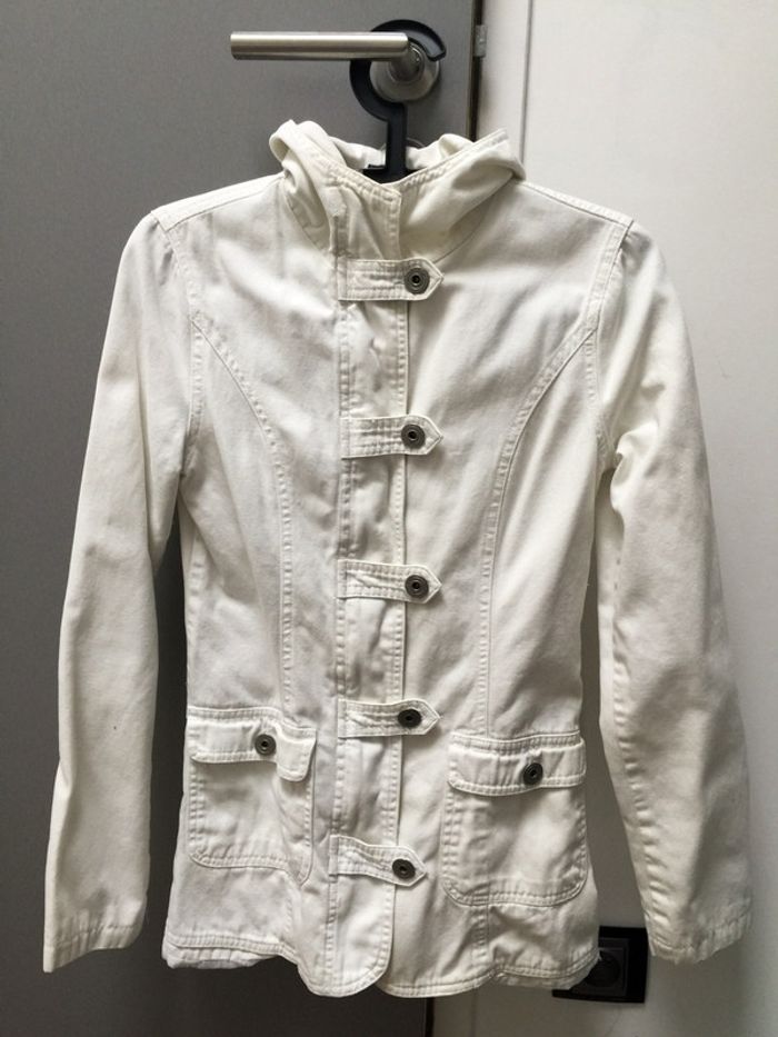 Veste légère parfaite pour mi saison qui se ferme avec fermeture éclair et boutons Taille S mais taille petit convient à un petit 36 voir un 34/36