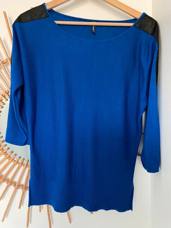 Pull bleu électrique avec épaules en similicuir noir Peu porté en très bon état Remise automatiquement appliquée sur les lots