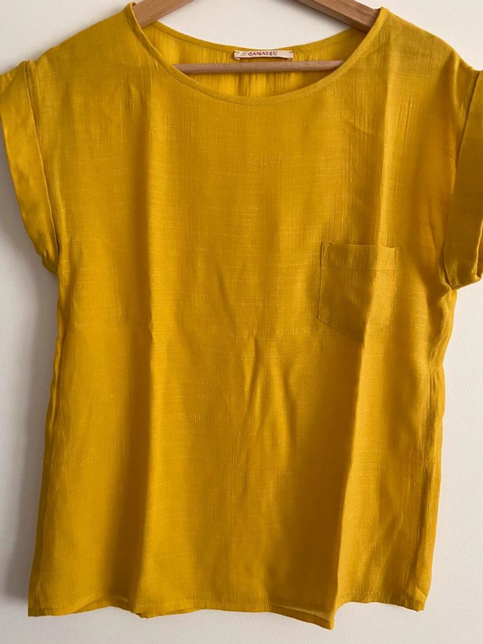 Joli haut jaune moutarde Camaïeu agréablement léger pour l’été Taille 36 (étiquette taille coupée) Légèrement transparent, en parfait état Remise automatiquement appliquée sur les lots