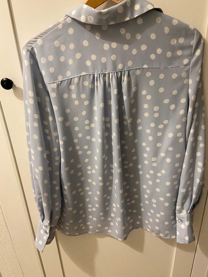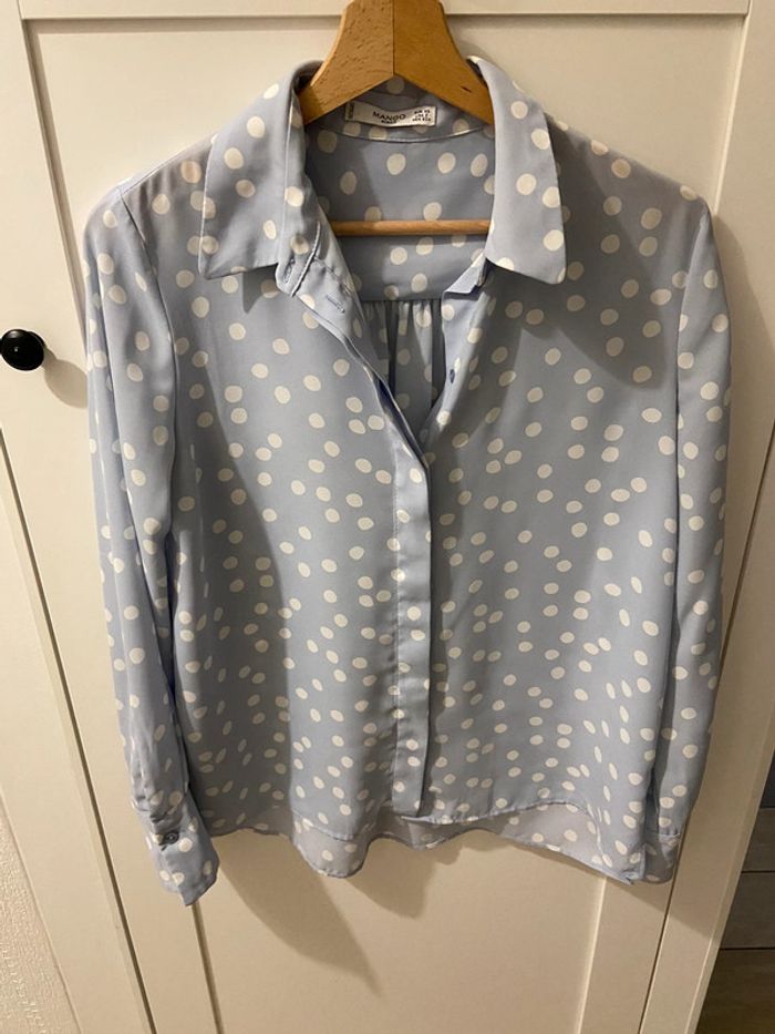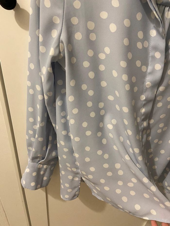 Belle chemise fluide bleu clair à gros pois blancs.